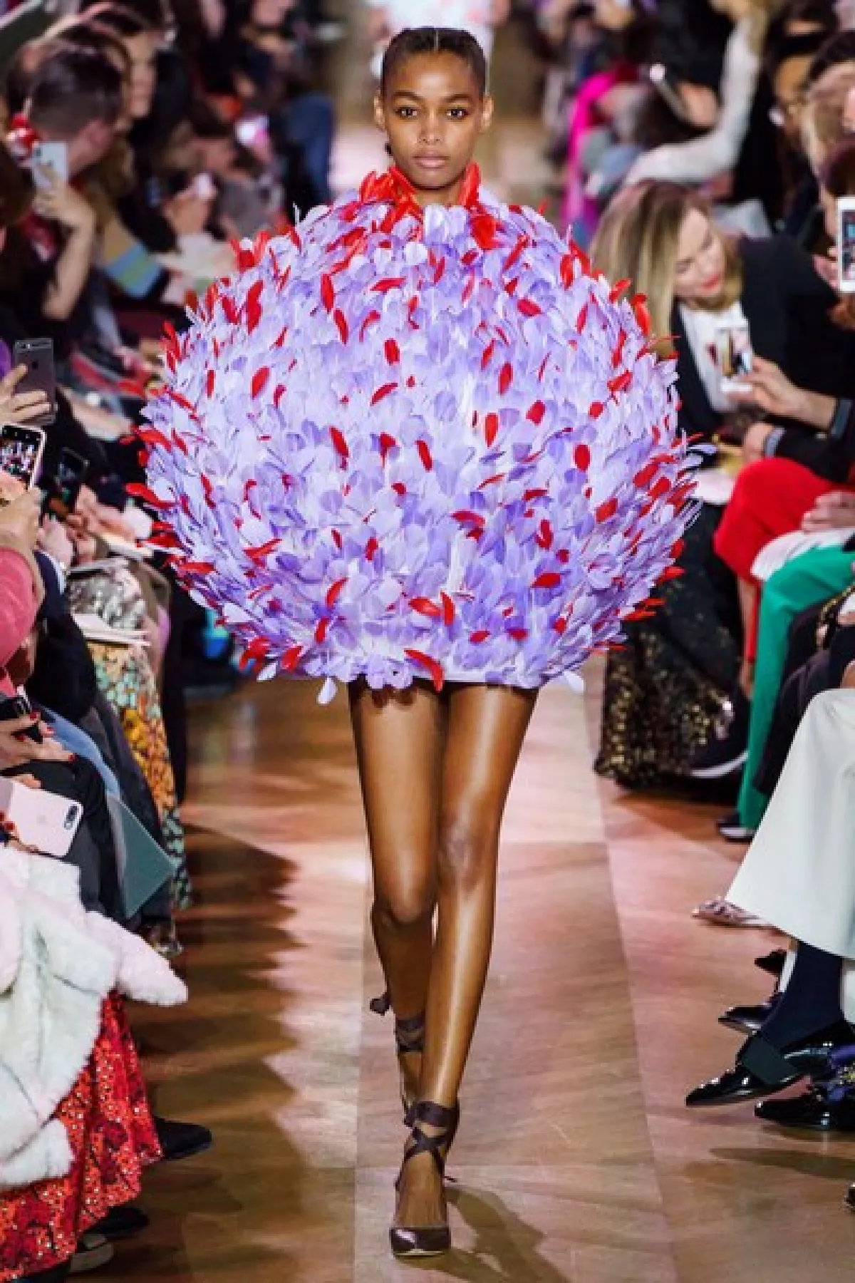 كما وظهر الريش لدى سكياباريلي Schiaparelli من خلال فستان سهرة قصير ذي تصميم كامل من الريش ودائري الشكل، باللونين الأحمر والبنفسجي الفاتح .