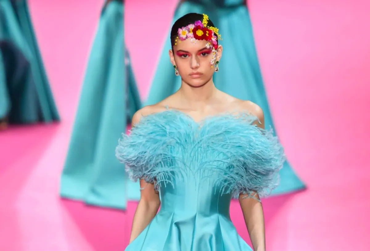 زيّن الريش القسم الأعلى من فساتين أليكسي مابيل Alexis Mabille، حيث رصدناه خلال أسبوع باريس للأزياء الراقية من خلال فستان سندريلا الملكي باللون التركواز واستعان لتنفيذه بـ قماش الساتان الفاخر.