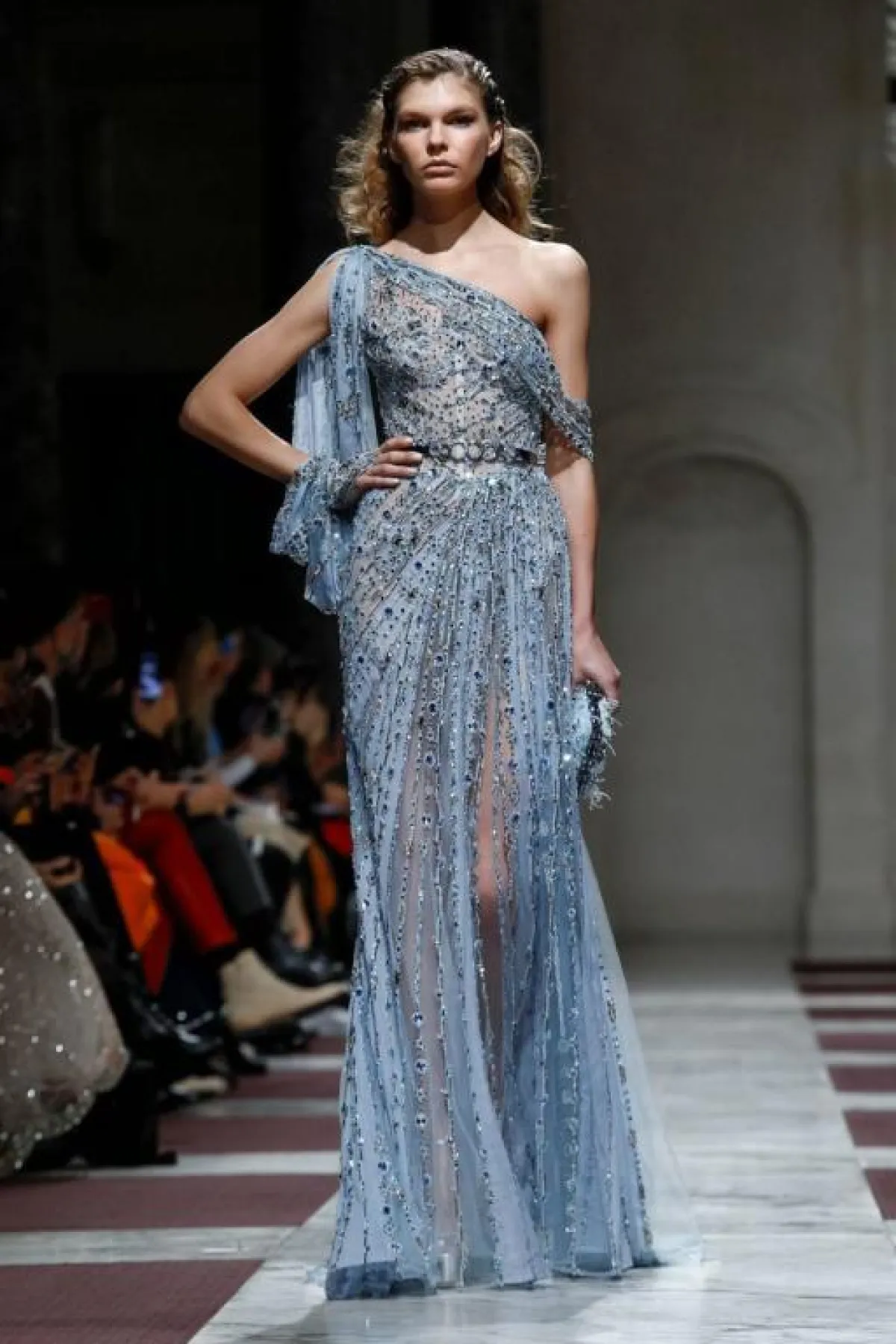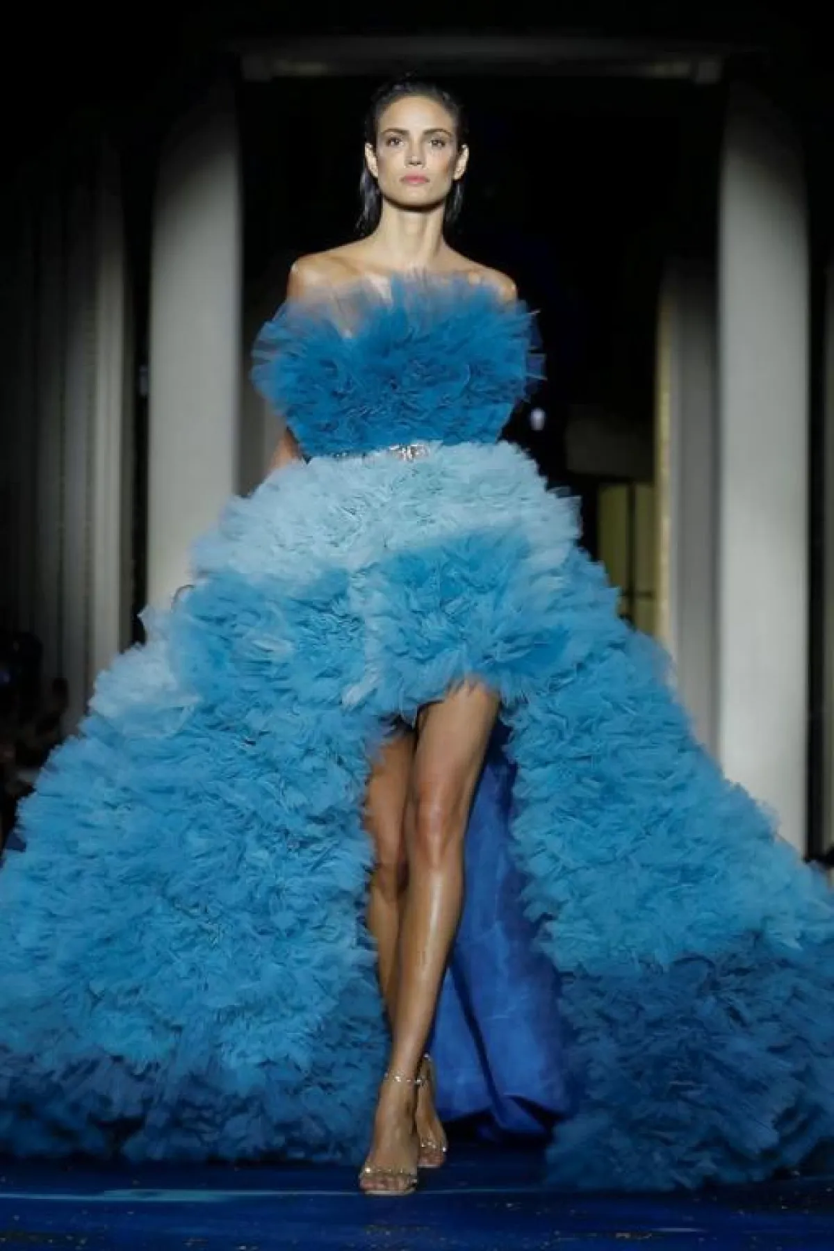 وكذلك أبدع إيلي صعب فساتين زرقاء بقصّات أنثوية مع شق جانبي طويل يكشف الساق، ومزينة بأحزمة حول الخصر مع لمسات ذهبية أو برّاقة.