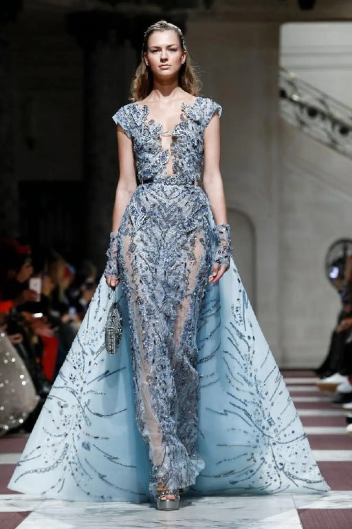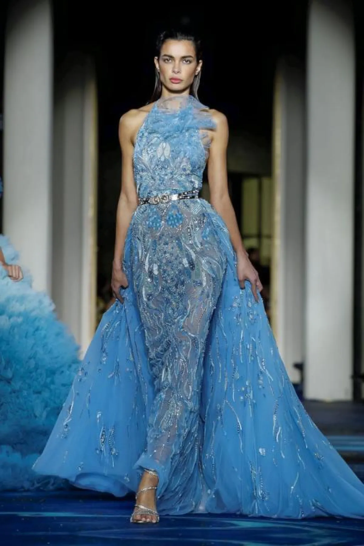 أيضاً قدم زهير مراد فستان A Line بأكمام طويلة وقبّة V باللون الأزرق مع تطريزات زرقاء، وفستان أنثوي بصيحة الـPeblum وشق جانبي طويل مع حزام الخصر الذي يبرز القوام النحيل.