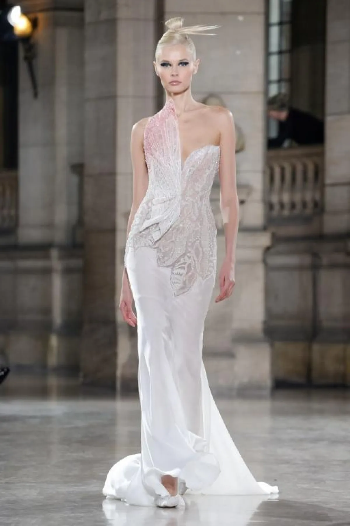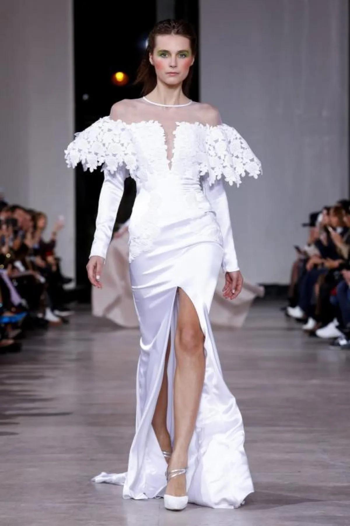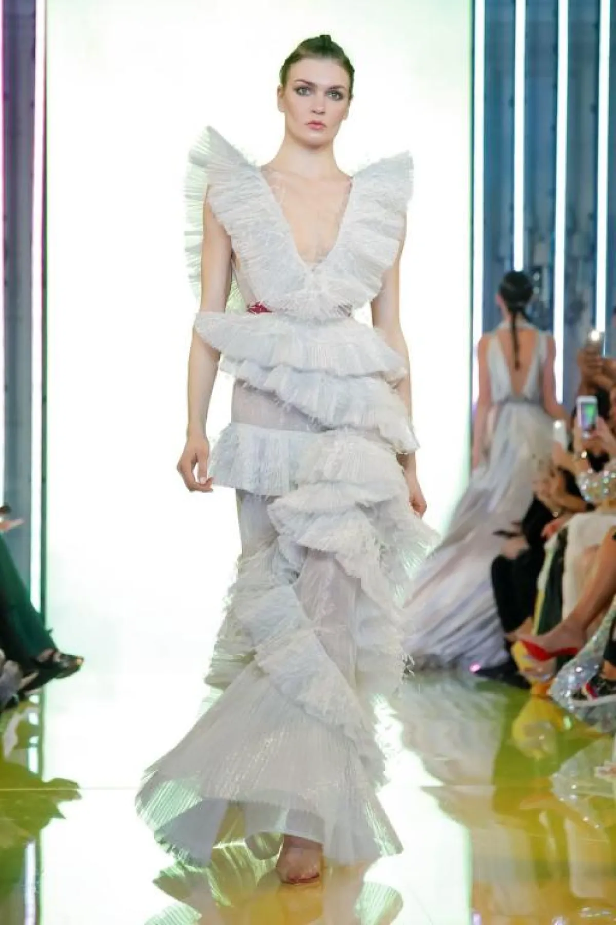لنبدأ مع المصمم اللبناني إيلي صعب Elie Saab والفستان البرّاق الذي إختتم به عرضه، حيث أنه بلون النيود والقماش الشفاف الراقي، ومزين ببريق اللون الفضي، مع تصميم منفوش يذكرنا بأميرات القصص الخيالية.
