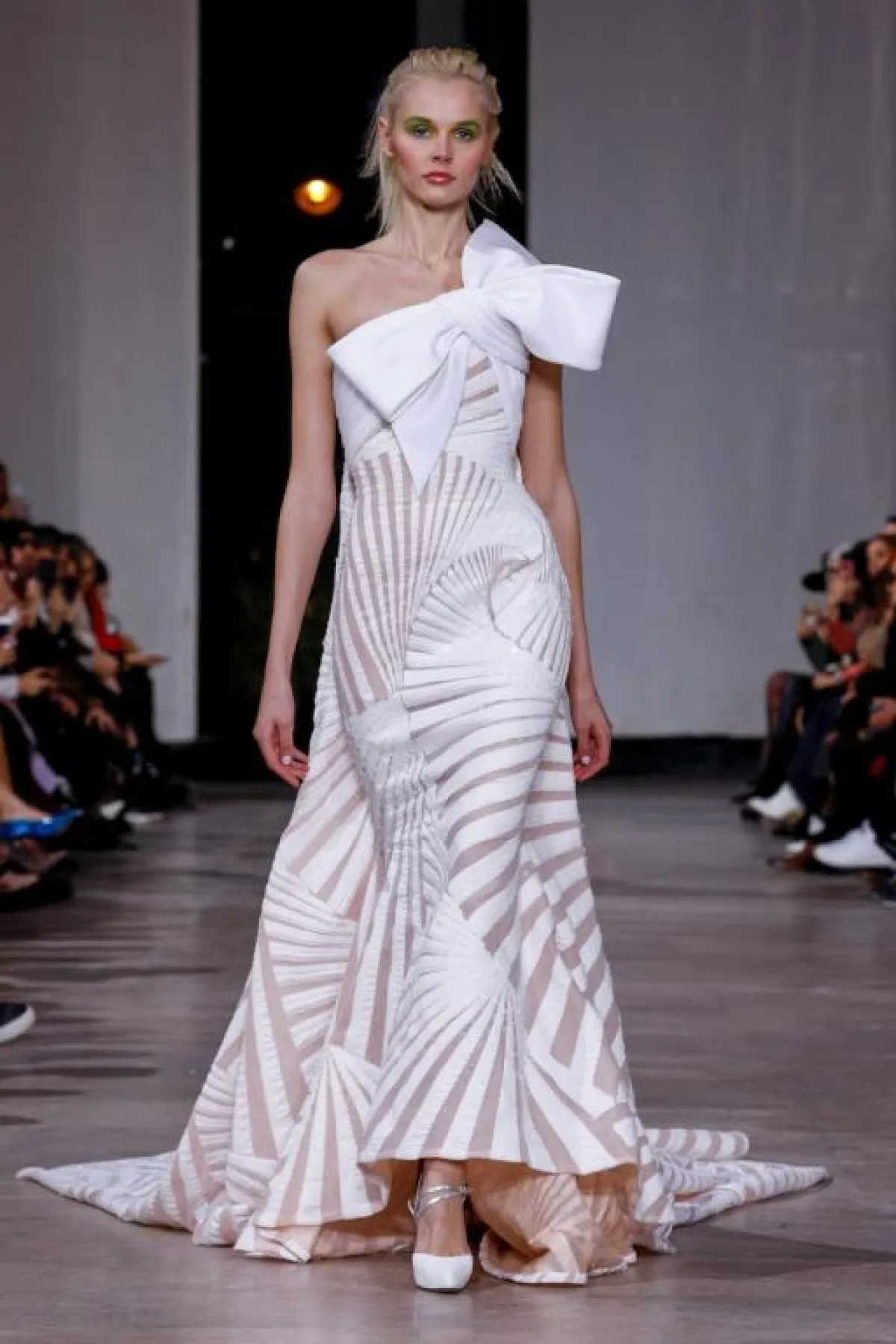 وبتصميم يجمع بين الأنوثة والفخامة، تألقت العارضة في نهاية عرض أزياء رامي قاضي Rami Kadi بتصميم يخطف الأنفاس، حيث فستان الزفاف المنفوش المزين بلمسات ذهبية، مع قصّة أوف شولدر بالأكتاف المنسدلة لمزيد من الأنوثة.