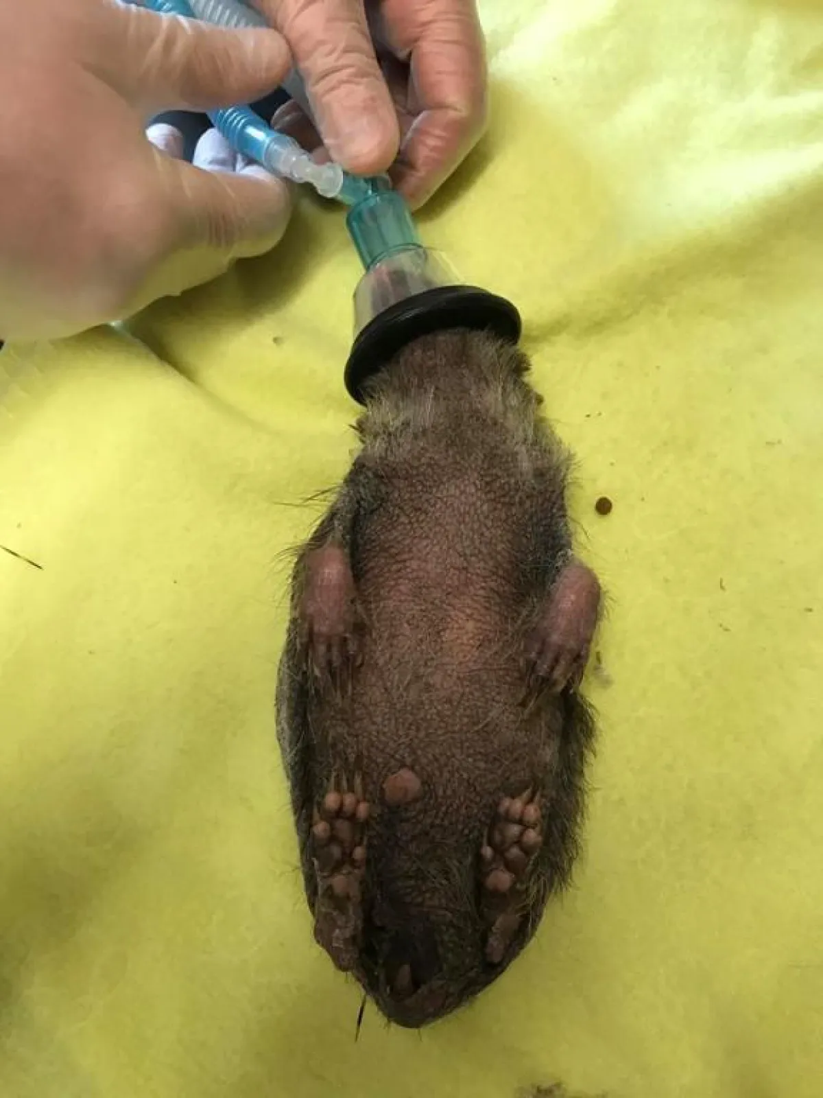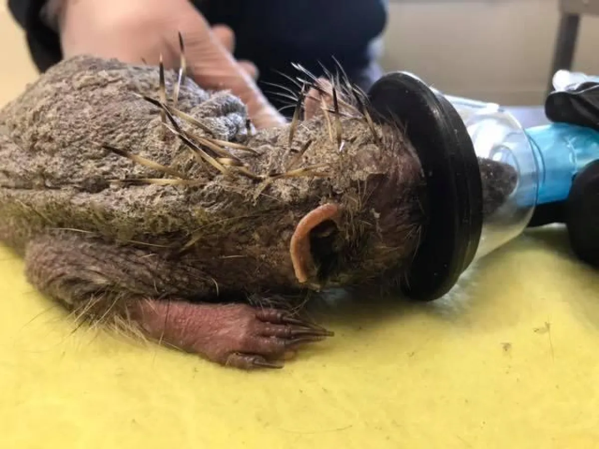 ووفقاً لما ذكرته صحيفة الـ«ديلي ميل» البريطانية، فقد صرح الموظفون العاملون في مركز إنقاذ الحيوانات «كوان والدلايف ريسكيو Cuan Wildlife Rescue»، أنهم ولأول مرة خلال عملهم، يشاهدون هذه الحالة السيئة لأحد القنافذ. حيث قالت «فران هيل»، وهي مديرة المركز: «أعمل في المركز منذ عشر سنوات، رأيت خلالها 6 أو 7 قنافذ صلعاء، لكن الوضع لم يكن بهذا السوء أبداً بالنسبة إلى هذا القنفذ المسكين، لأن القنافذ التي رأيتها سابقاً فقدت 65 إلى 70% من إبرها. أما (الدب) فقد خسر نحو 97% من إبره»، وتابعت «هيل» حديثها: «لقد وضعنا أمامه طعام القطط وأكل كثيراً وشرب ماء لمدة 4 دقائق كاملة دون توقف».