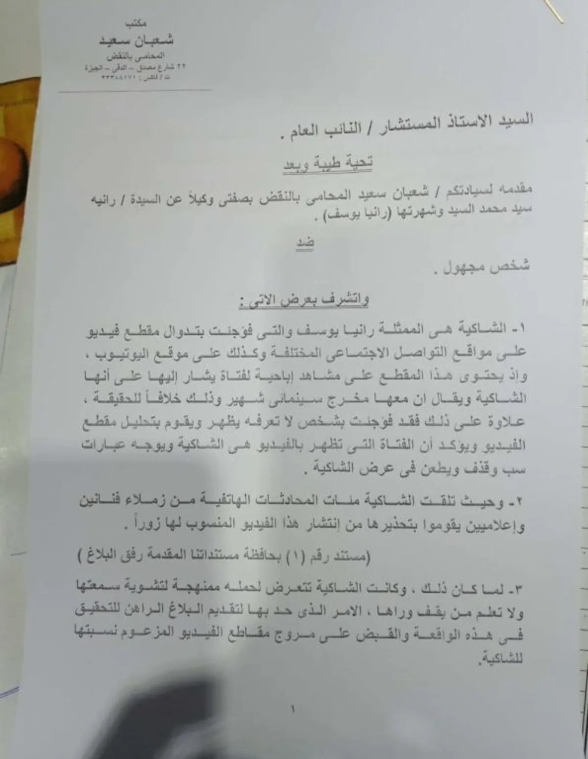 نفذت الفنانة رانيا يوسف تهديدها، وتقدمت ببلاغ رسمي إلى النائب العام المصري، تتهم فيه "شخصًا مجهولًا" بترويج شائعات عن وجود فيديو فاضح لها، مؤكدة أنّ هناك حملة منظمة تستهدف النيل من سمعتها، وطالبت بالبحث عن "المجهول" وتقديمه إلى المحاكمة لمعرفة من وراء هذه الحملة.