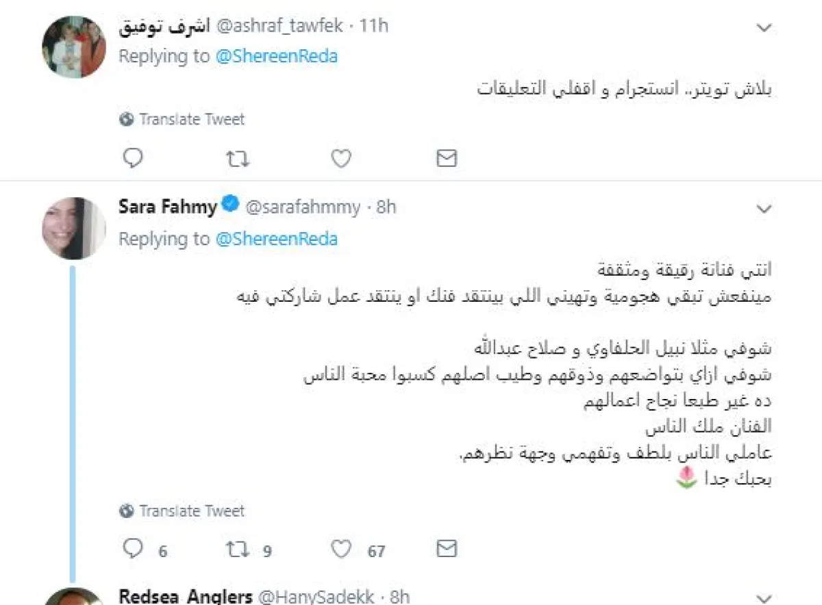 شيرين تلقت تعليقات "عاقلة" و"هادئة" على تغريدتها الأخيرة، فنصحتها الناشطة سارة فهمي بالتعلم من تجربة الكبار قائلة: إنتِ فنانة رقيقة ومثقفة، مينفعش تبقي هجومية وتهيني اللي بينتقد فنك أو ينتقد عمل شاركتِ فيه ، شوفي مثلًا نبيل الحلفاوي وصلاح عبدالله ، شوفي ازاي بتواضعهم وذوقهم وطيب أصلهم كسبوا محبة الناس، ده غير طبعًا نجاح أعمالهم، الفنان ملك الناس، عاملي الناس بلطف وتفهمي وجهة نظرهم.