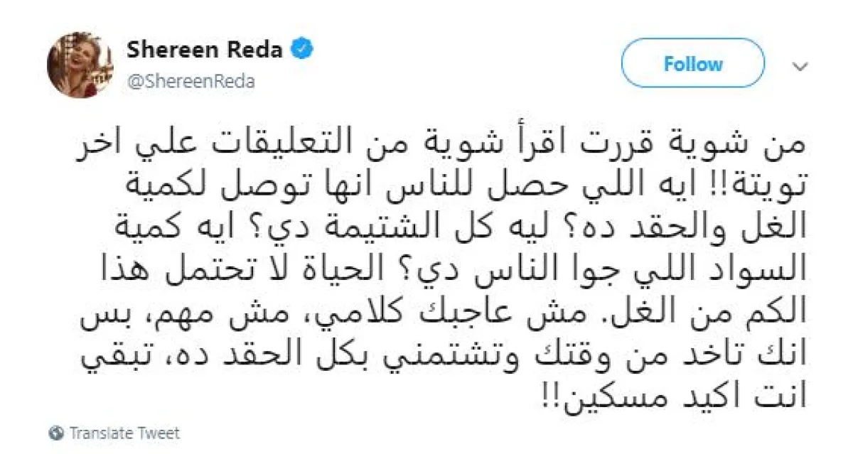 أبدت الفنانة المصرية شيرين رضا صدمتها من تعليقات جمهورها على تغريداتها، وطالبت كل من يرفض أفكارها وتصريحاتها، بالتوقف عن متابعة حساباتها بمواقع التواصل الاجتماعي، لأنّ الحياة بحسب كلامها لا تحتمل كل هذا الغلّ والحقد والقلوب السوداء!!