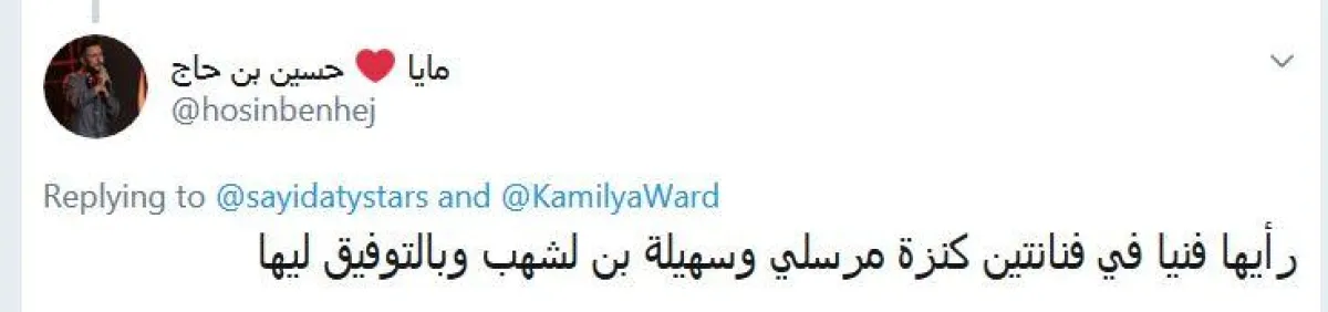 أجابت كاميليا "كنزة مرسلي وسهيلة بن لشهب ابنتا بلدي، وأتمنّى لهما كل التوفيق في مسارهما الفنّي، كما أتمنّاه لشخصي. أما رأيي بفنّهما أتركه لنفسي، المهم أنّني أتمنّى لكل منّا أن تثبت نفسها فنياً للمدى البعيد لا القريب فحسب، وهذا يتطلّب جهداً كبيراً وصبراً، بما أنّني معهما في نفس الموجة، الكلام موجّه لي أيضاً".