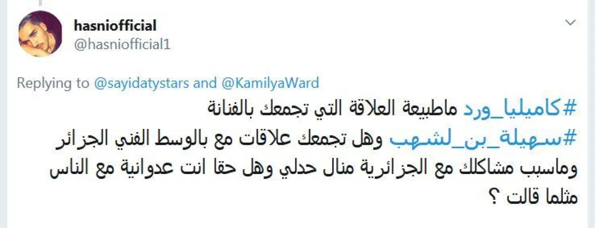 -ما طبيعة العلاقة التي تجمعك بالفنانة #سهيلة_بن_لشهب وهل تجمعك علاقات مع الوسط الفني الجزائري وما سبب مشاكلك مع الجزائرية منال حدلي وهل حقا أنت عدوانية مع الناس مثلما قالت؟
