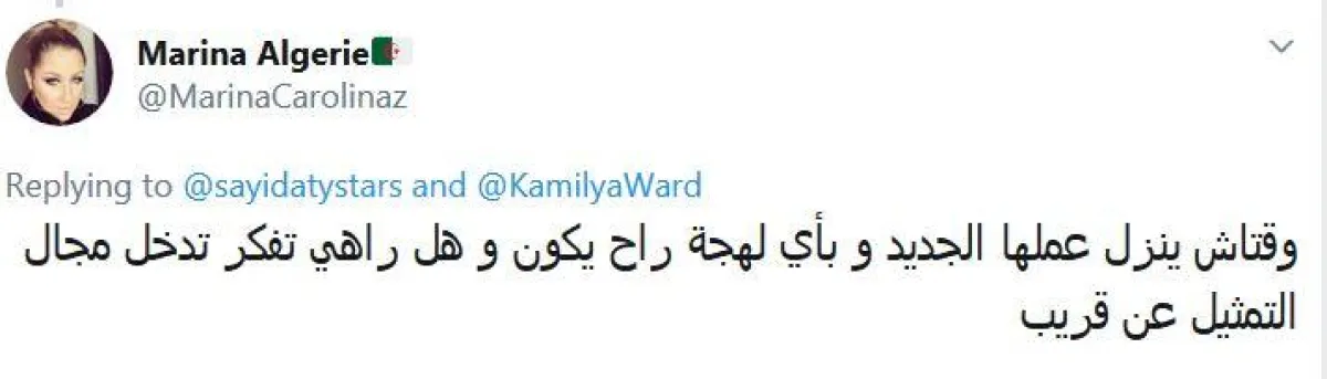 وعن الشق الثاني من السؤال كان جوابها "بخصوص ديو مع أحد فنّاني بلدي الجزائر هذا أمرٌ يشرّفني، لكن بالفترة الحاليّة مشروع الديو غير مطروح، إنّما في المرحلة المقبلة المشروع وارد".