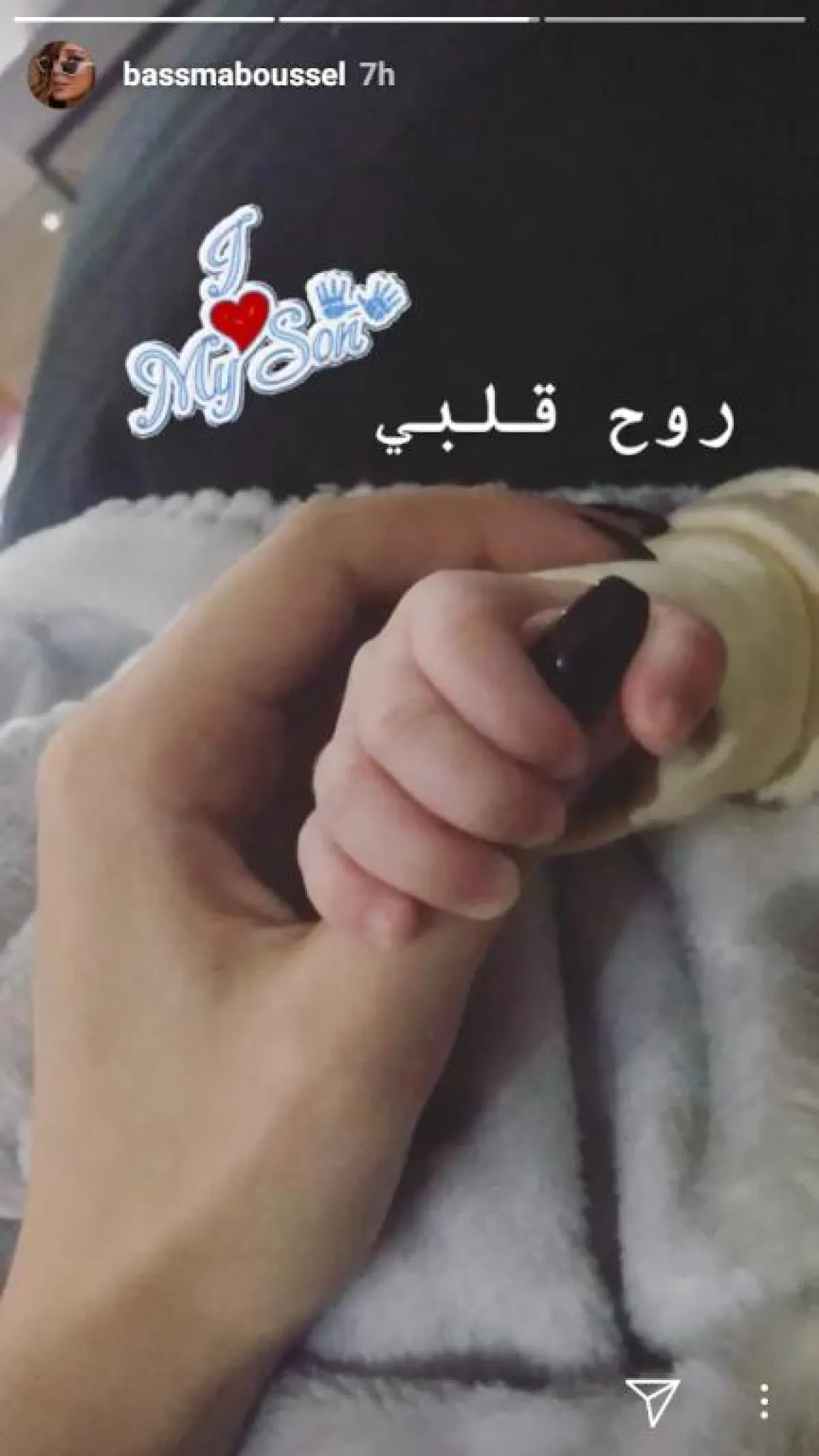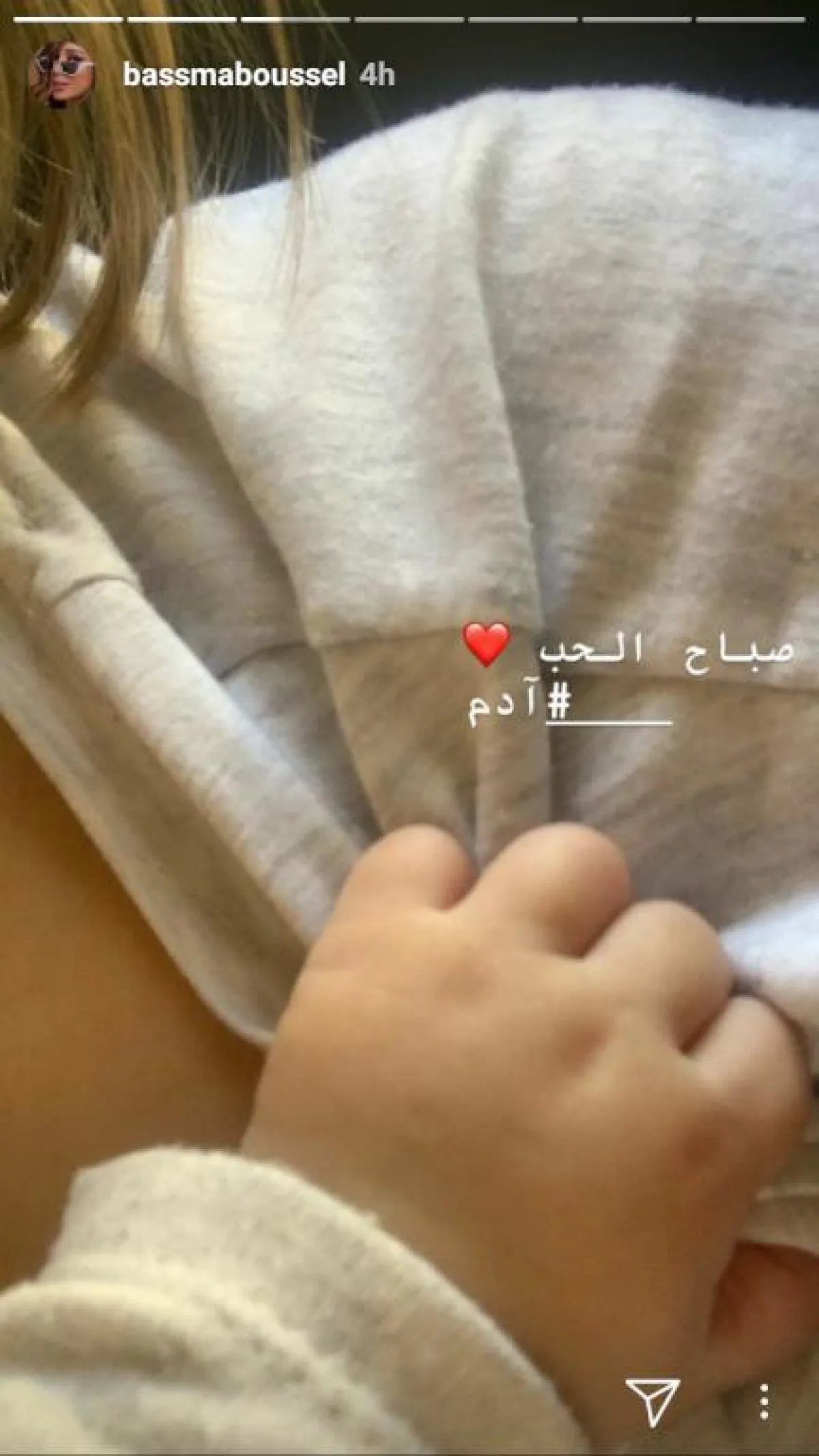 ولم تكشف بسمة بوسيل عن وجه طفلها آدم، بل إكتشفت بنشر يده الصغيرة وهي تمسك سترتها.
