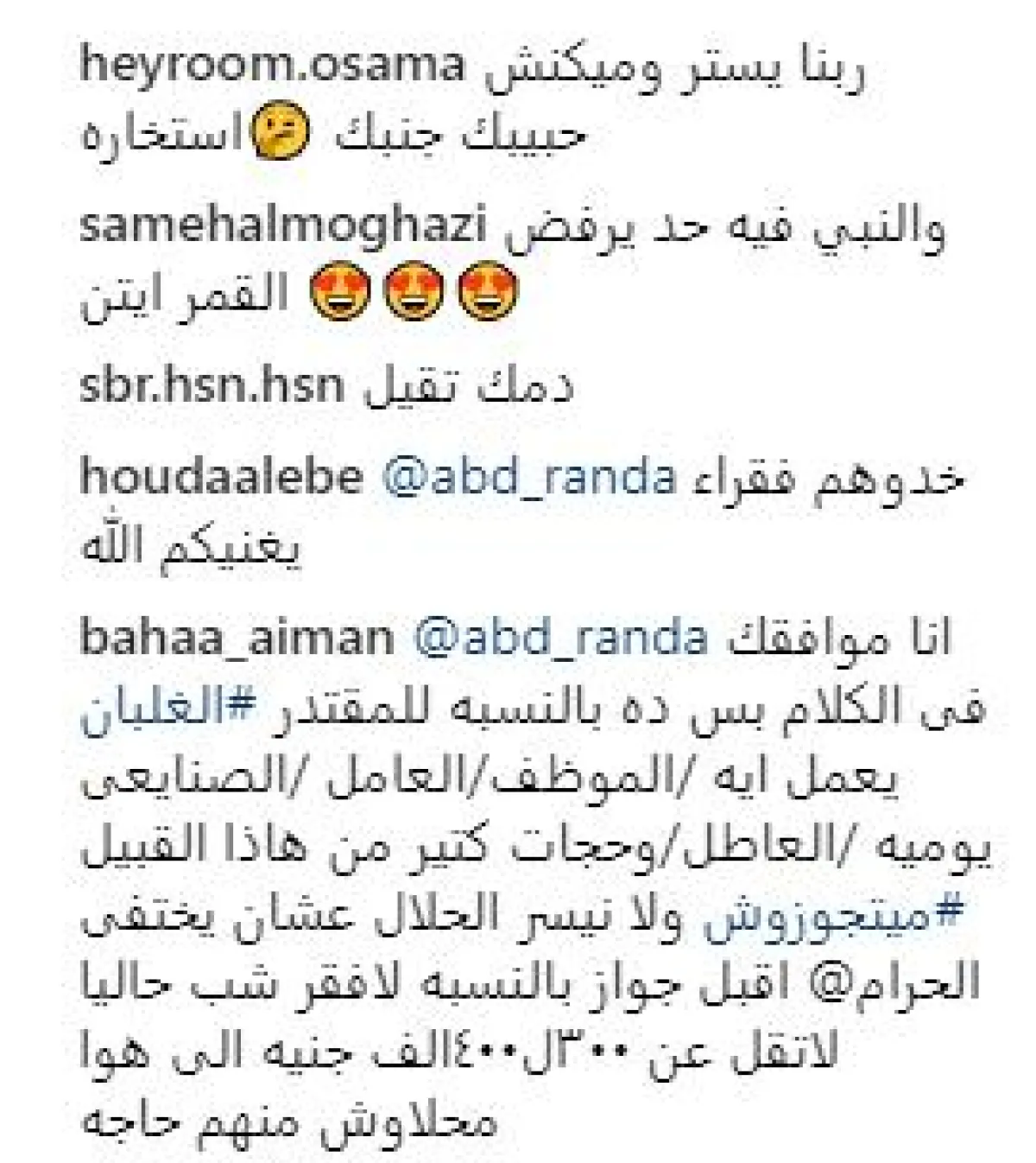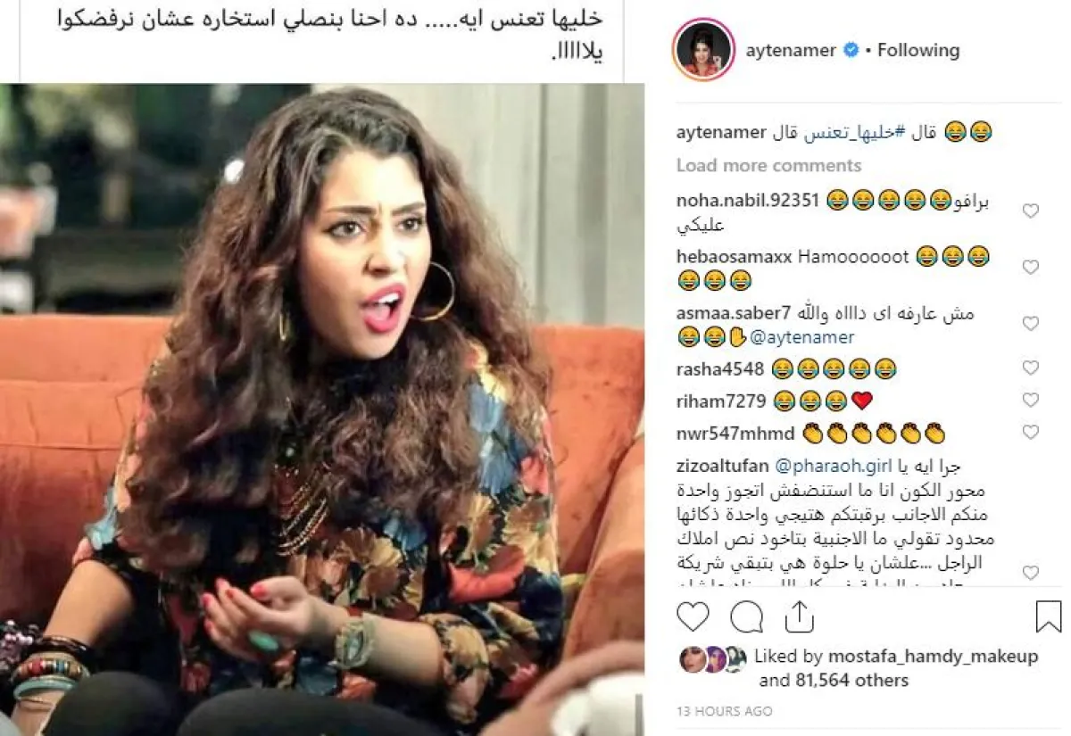 آيتن علقت عبر حسابها بموقع إنستقرام قائلة: خليها تعنس ايه دا احنا بنصلي استخارة عشان نرفضكم يلااا، وأضافت تعليقاً على الصورة: قال خليها تعنس قال.