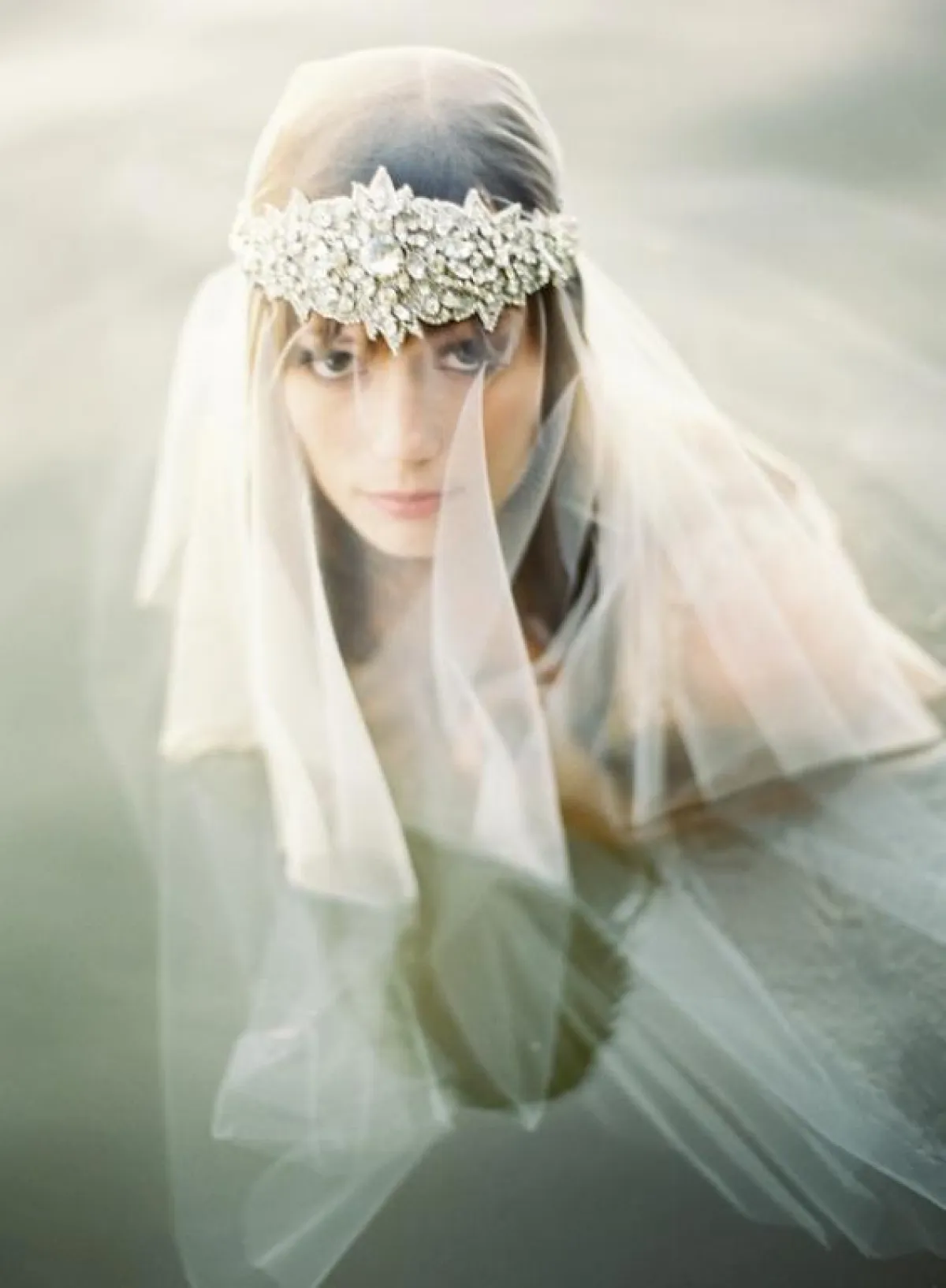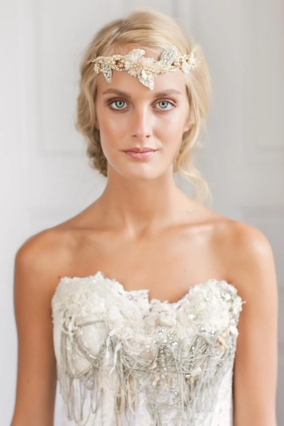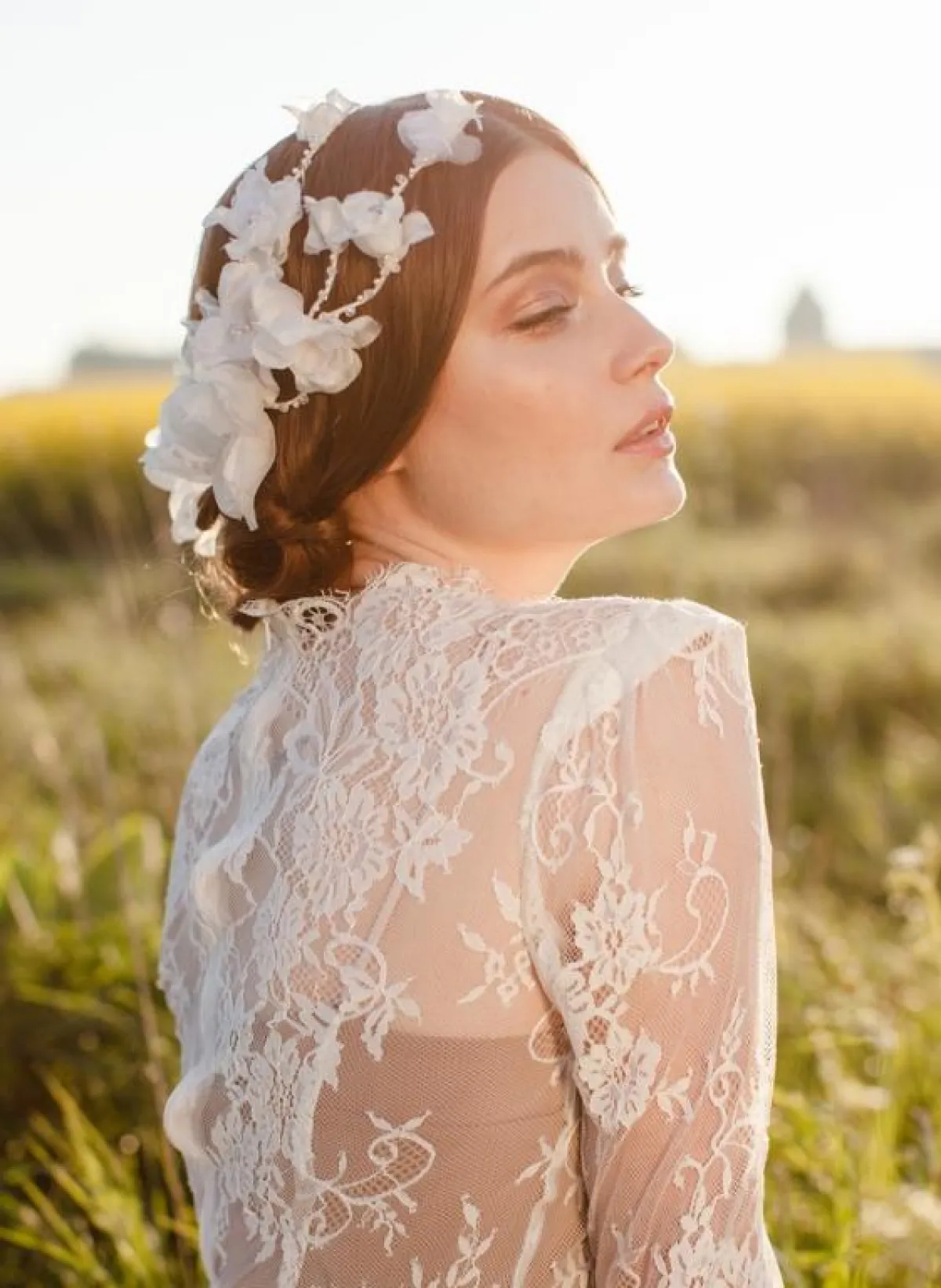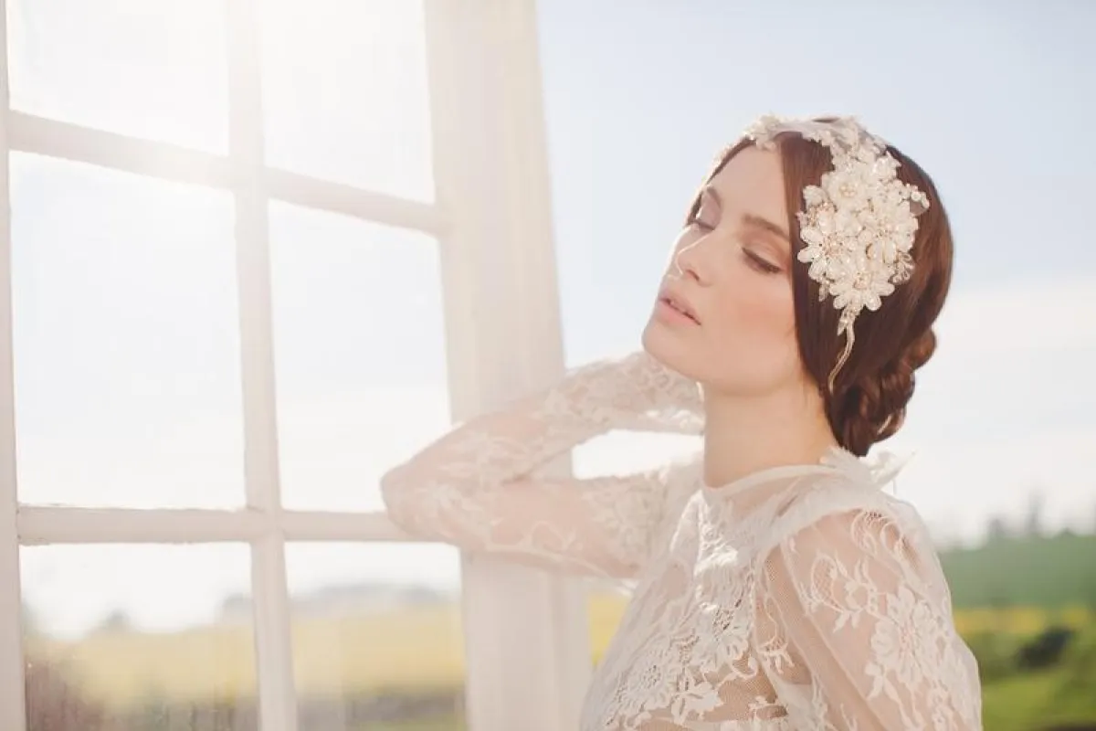 1 ـ احرصي على أن تكون الزينة اللمّاعة المستخدمة في الفستان هي نفسها تلك المستخدمة لصنع التاج أو الطرحة. إن كان الفستان يتضمّن وروداً، اختاري زينة رأس فيها ورود.