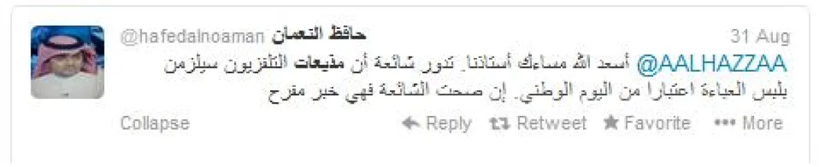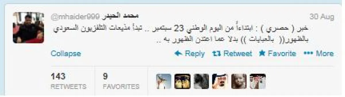 غرد الإعلامي محمد الحيدر قائلاً: "خبر (حصري): ابتداء من اليوم الوطني 23 سبتمبر، تبدأ مذيعات التلفزيون السعودي الظهور بالعباءات بدلاً مما اعتدن الظهور به".