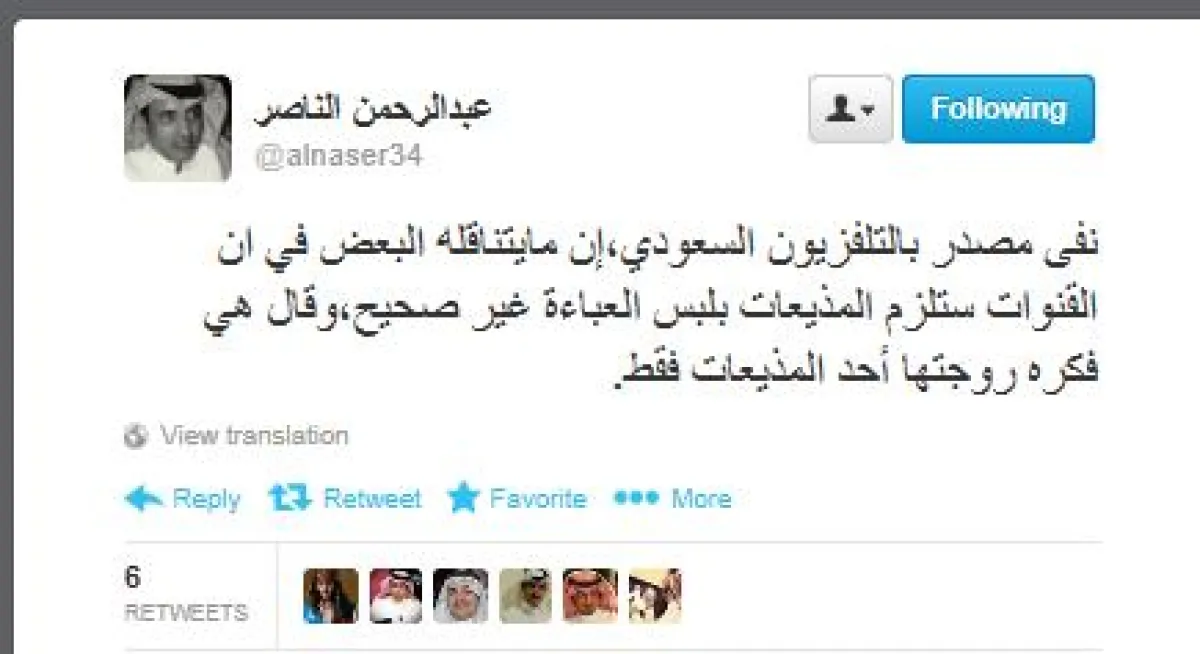 فيما نفى المذيع عبد الرحمن الناصر ذلك بقوله عبر تغريدته: " في مصدر بالتلفزيون السعودي إن ما يتناقله البعض في أنّ القنوات ستلزم المذيعات بلبس العباءة غير صحيح، وقال هي فكرة روجتها إحدى المذيعات فقط". وكان المغردون منهم من يرى أنه فكرة صائبة والبعض الآخر لم تعجبه لهذه الفكرة: