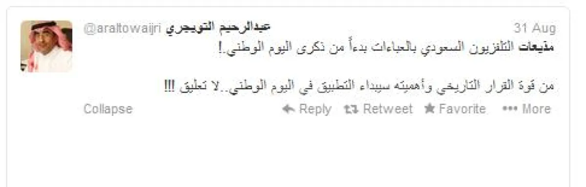 1. يرى عبد الرحيم التويجري ‏@araltowaijri أهمية لهذه الفكرة من وجهة نظره بقوله: "مذيعات التلفزيون السعودي بالعباءات بدءًا من ذكرى اليوم الوطني. من قوة القرار التاريخي وأهميته سيبدأ التطبيق في اليوم الوطني..لا تعليق"!