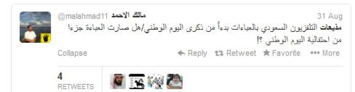 3. استنكر مالك الأحمد ‏ @malahmad11 هذا الخبر بقوله: "مذيعات التلفزيون السعودي بالعباءات بدءاً من ذكرى اليوم الوطني؟هل صارت العباءة جزءًا من احتفالية اليوم الوطني؟!"