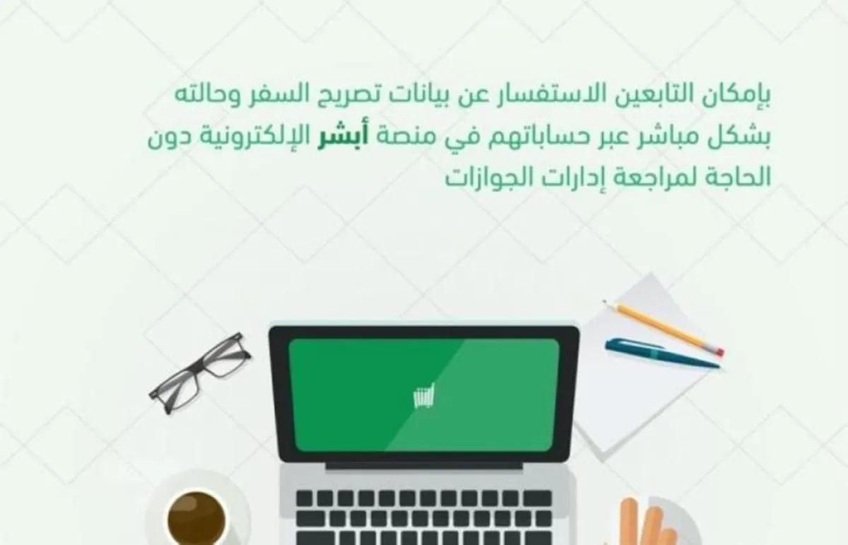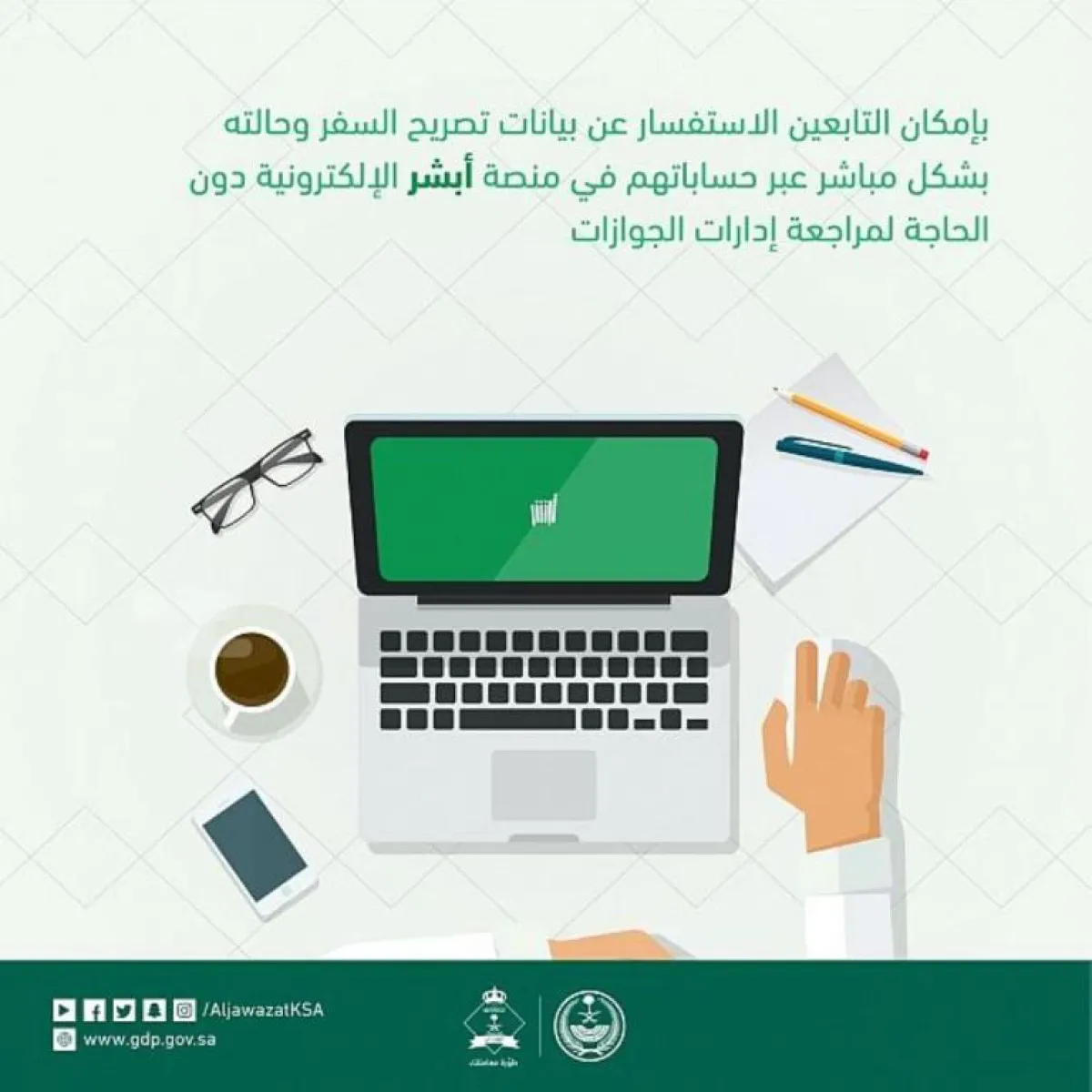 أعلنت المديرية العامة للجوازات، إطلاق خدمة جديدة للاستفسار عن حالة تصريح السفر للتابعين، وذلك من خلال منصة "أبشر" الإلكترونية.