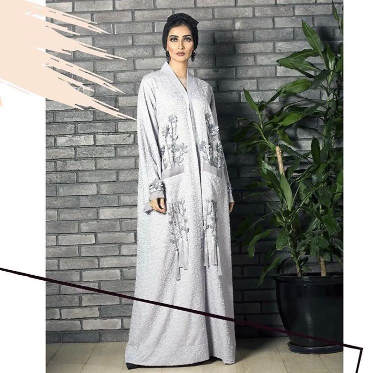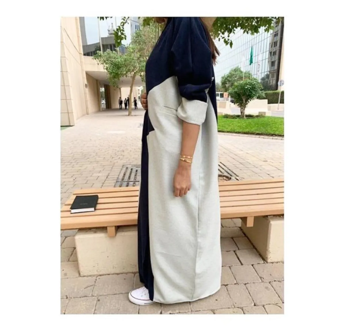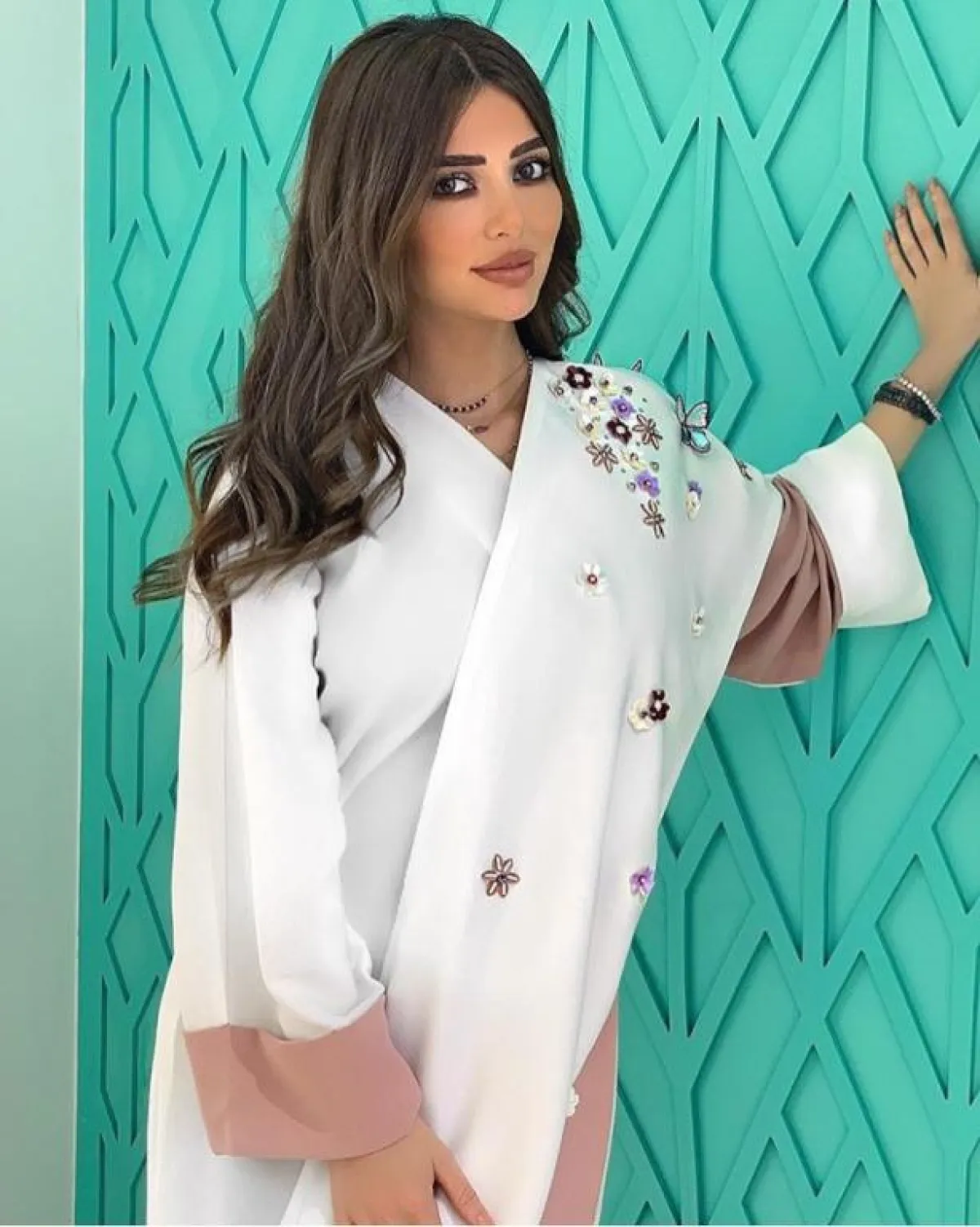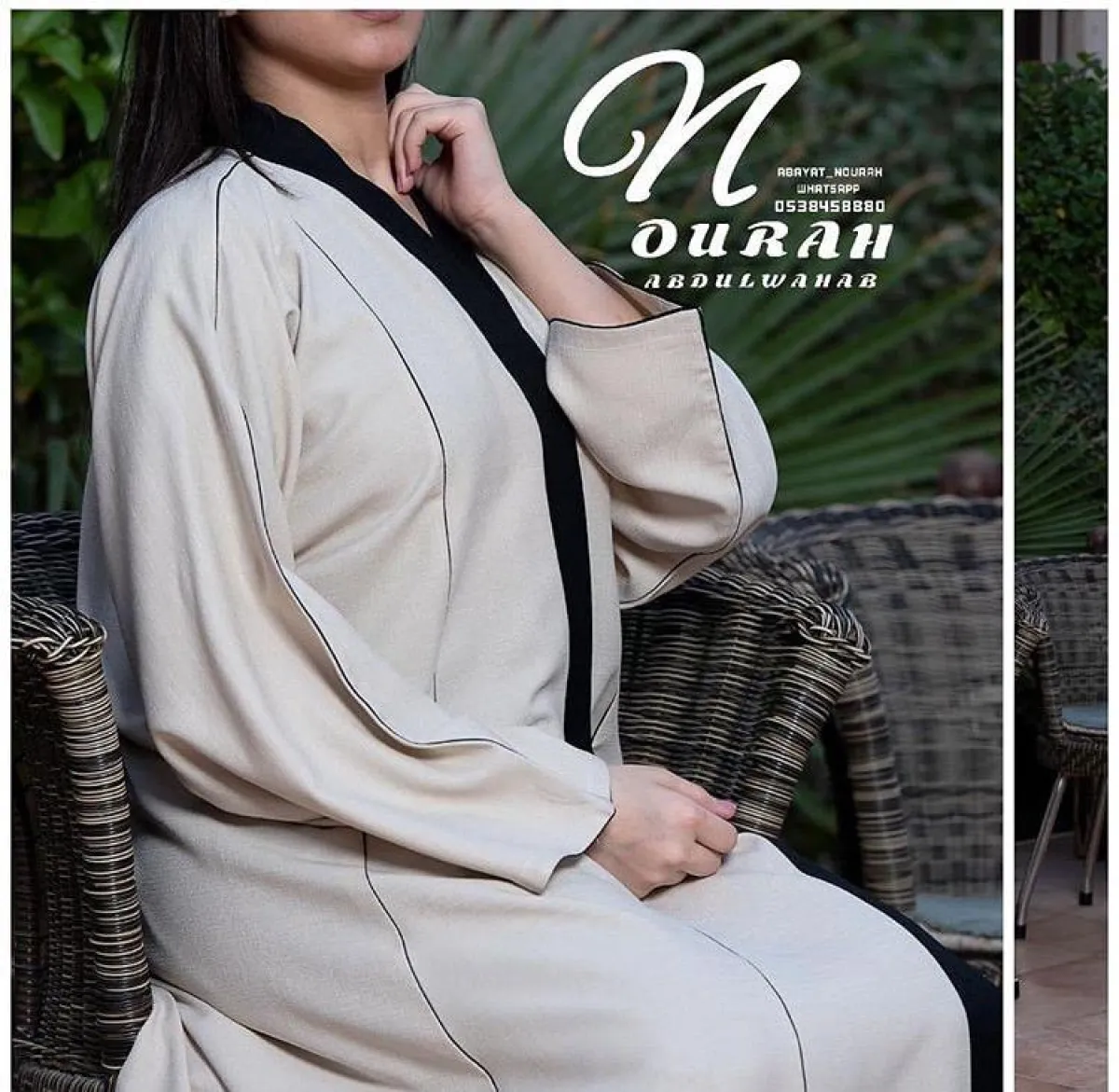 الخامات المخملية تم دمجها بطريقة ذكية مع العباية البيضاء من Seasonal Abaya سيزونال عبايه، بأكتاف كحلية اللون، منسدلة من الصدر بخامة الكتان البيضاء الرمادية، تناسب كل أعمار الصبايا بخاصة العشرينيات، ويمكن لصاحبات الوزن المتوسط ارتداؤها بهذا الشكل، من دون أن تُبرز أيّ عيوب للجسم.