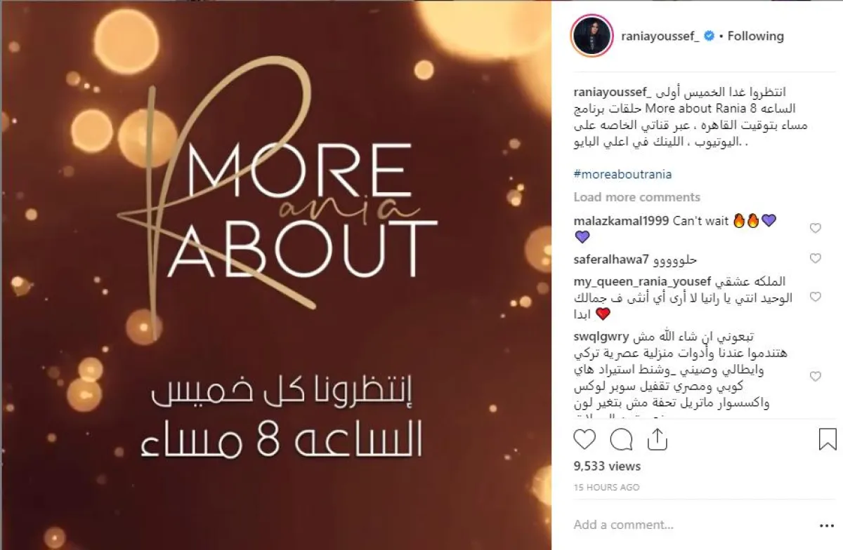 تبدأ الفنانة رانيا يوسف اليوم بث الحلقة الأولى من برنامجها التفاعلي الجديد"More about Rania" عبر القناة الرسمية الخاصة بها على موقع اليوتيوب، والمقرر عرضه كل خميس من كل أسبوع في تمام الساعة الثامنة مساء، في تجربة هي الأولى لنجمات الفن المصري.