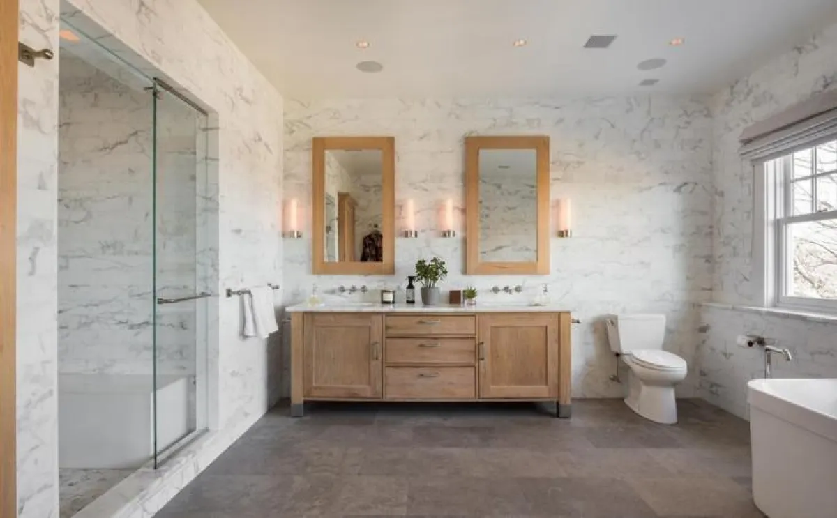 في منزل المُمثِّل بروس ويليس Bruce Willis وعارضة الأزياء والمُمثِّلة إيما هيمنغ Emma Heming، يكسو الرخام جدران الحمَّام الرئيس، فيما يبرز الخشب الفاتح على الخزائن وإطار المرآتين اللتين تعلوان حوض الغسل. وقد فُصلت مساحة الـ"دش"، بواسطة لوح زجاج شفَّاف.