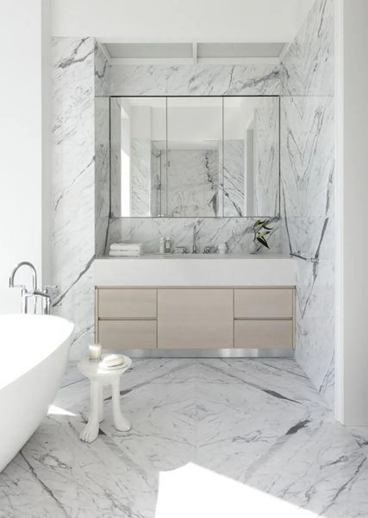في منزل المغنِّي الأمريكي جاستن تيمبرليك Justin Timberlak الواقع بحيِّ سوهو، يمتدُّ الحمّام الرئيس على مساحة مستطيلة، ويضمُّ زوجين من أحواض الغسل مدمجين بخزائن الخشب، وتعلوهما مرآة من دون إطار. وبجوار النافذة، يسترخي حوض الاستحمام الرخام.