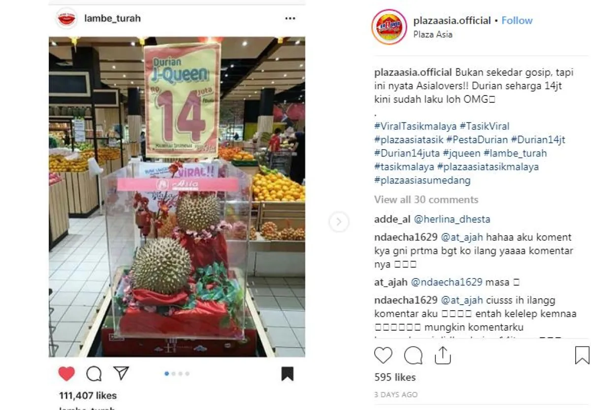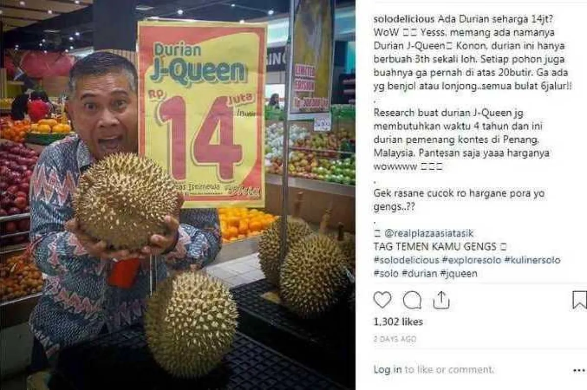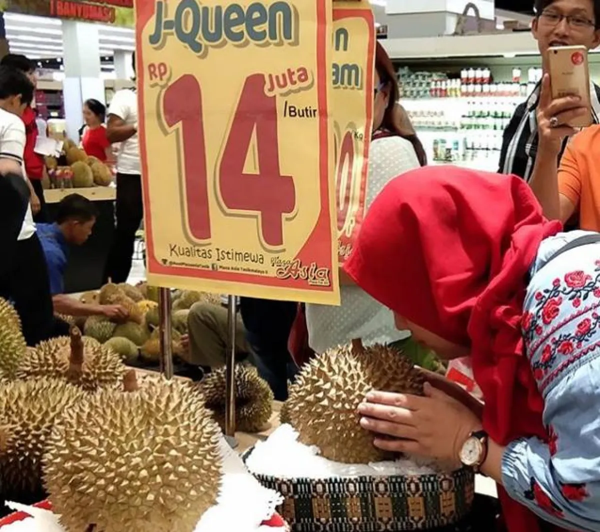 وذكر موقع «سكاي نيوز»، بأن هذا المركز التجاري الذي يقع في جزيرة «جاوة الغربية» في أندونيسيا، بدأ بعرض 4 حبات من نوع نادر جداً من فاكهة الـ«دوريان» الشهيرة، والتي تحظى بشعبية هائلة في العديد من بلدان بجنوب شرقي آسيا، بسعر يبلغ 14 مليون روبية للثمرة الواحدة، أي ما يعادل تقريباً الـ«ألــف دولار أميركي»، وهو بالنسبة إلى معدل رواتب الموظفين الأندونيسيين، يعادل 3 أضعاف متوسط الراتب الشهري في البلاد.