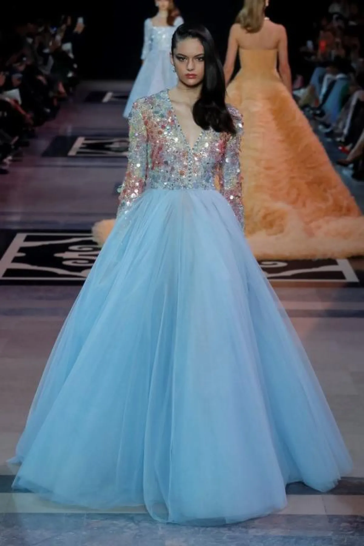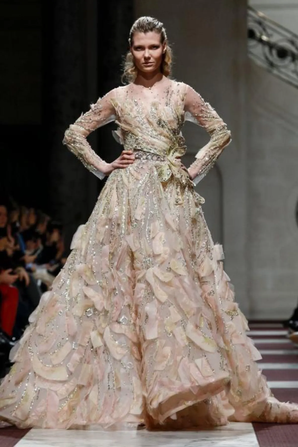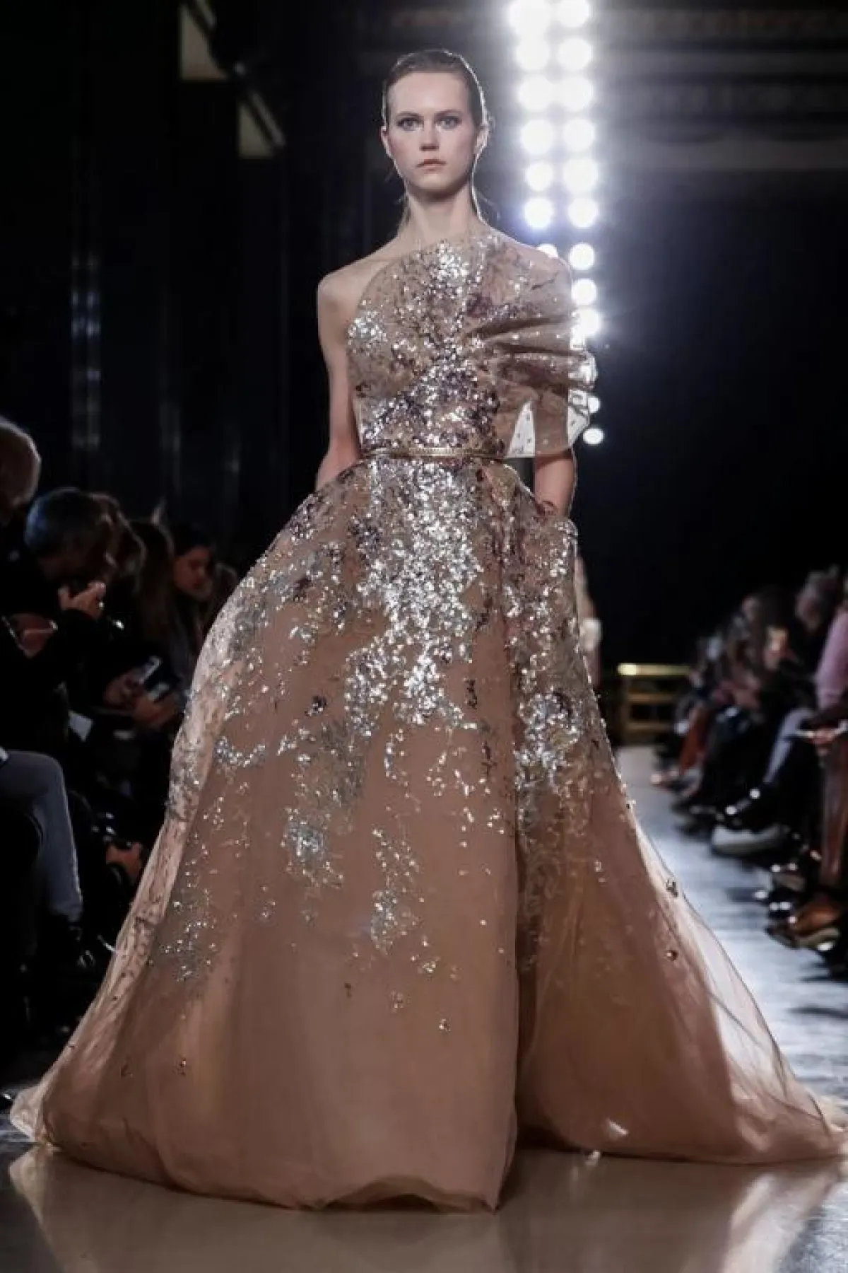 ومن عرض أزياء ايلي صعب Elie Saab، إخترنا لكِ فستان بني منفوش بقماش شفاف راقي مع لمسات لامعة تزين الفستان.