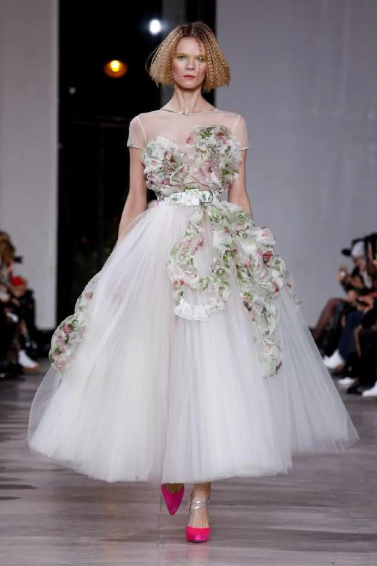 كذلك قدمت دار رالف وروسو Ralph & Russo فساتين منفوشة بتصاميم مختلفة، مثل الفستان البني الـHigh Low، والفستان الأبيض المطرز بالورود الملونة.
