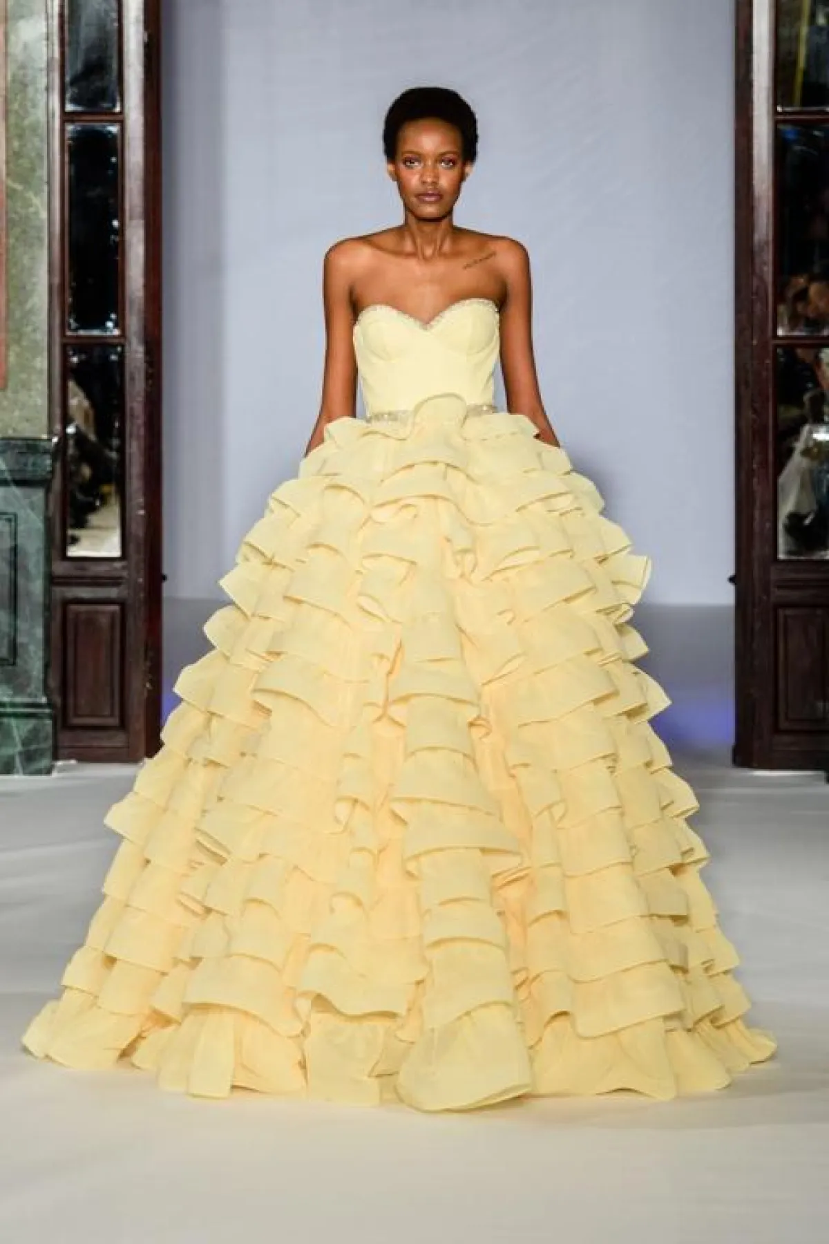 كما قدمت ماركة La Metamorphose فساتين منفوشة بطبقات متدرجة الأطوال، وبألوان جذابة مثل الأرجواني والأصفر.