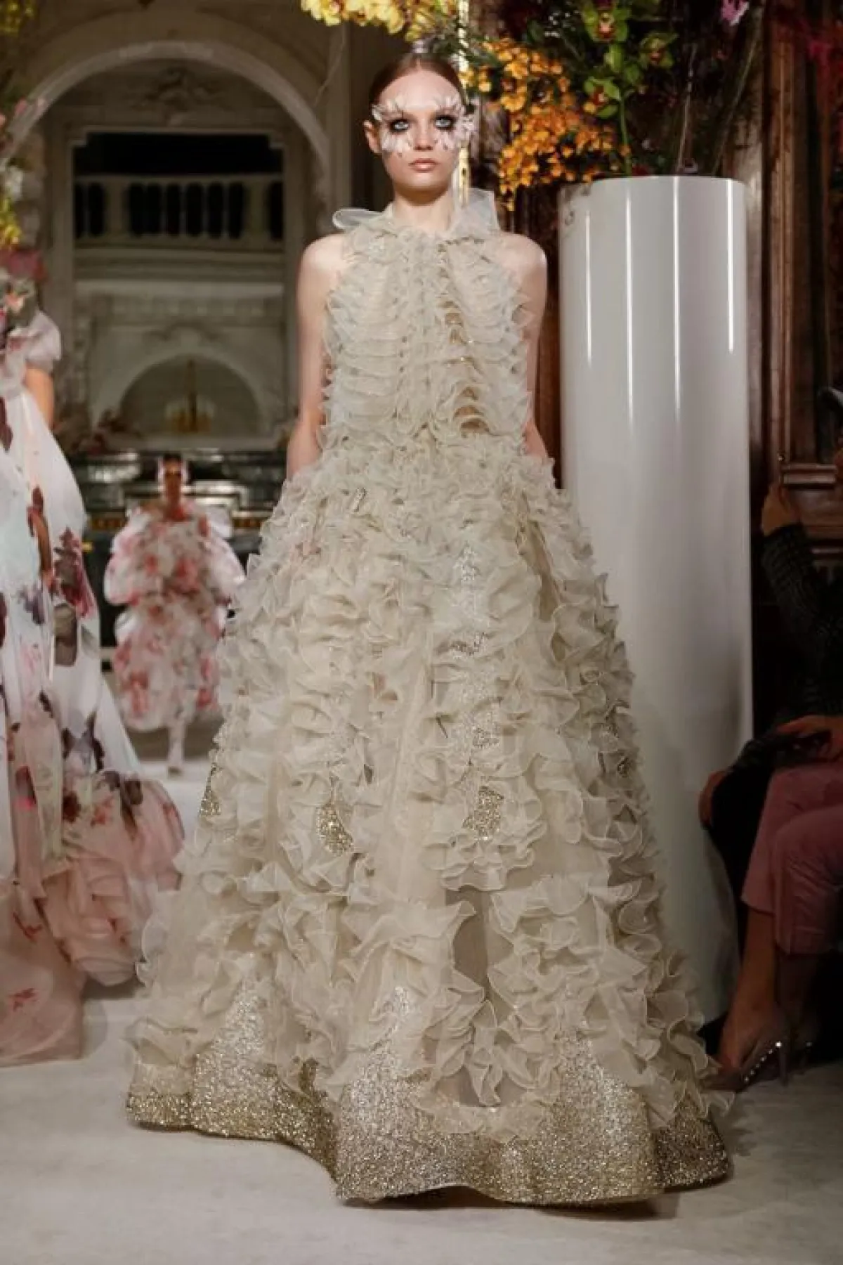 ولإطلالة لافتة للأنظار، يمكن إختيار فستان كشكش منفوش مثل فستان فالنتينو Valentino بالقصّة الـHalter والتطريزات الذهبية.