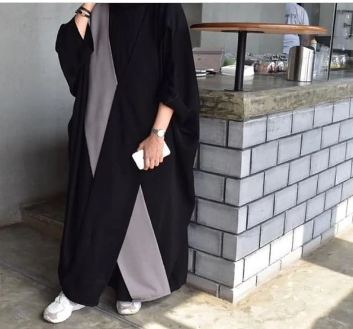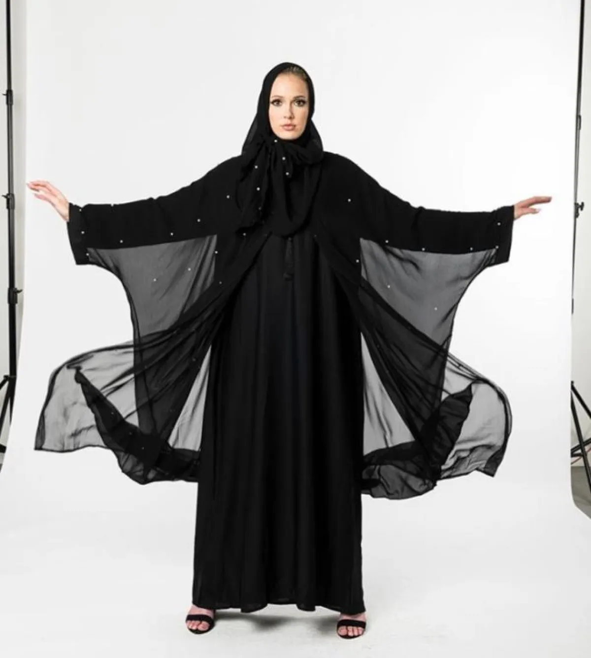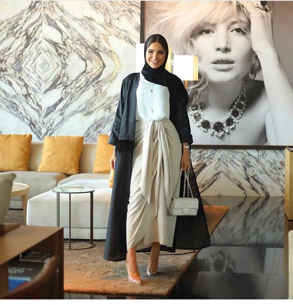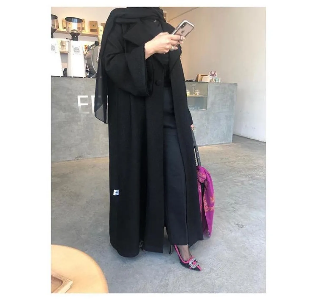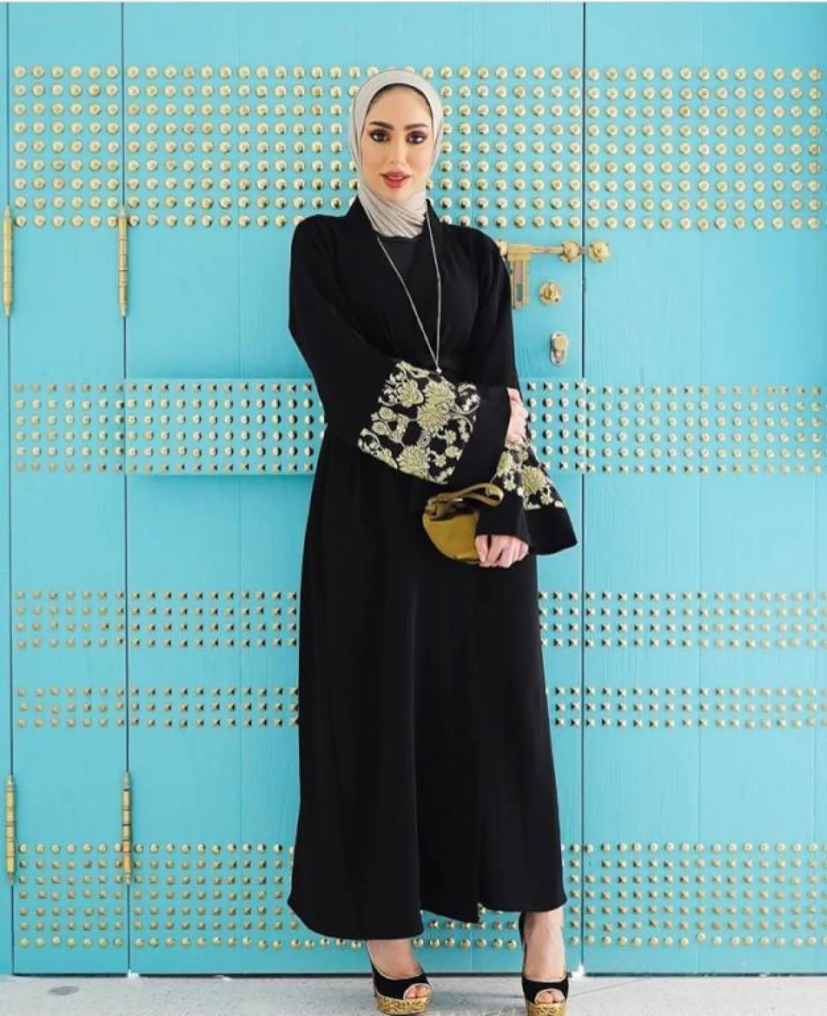 الأسود لطالما يكون غنيا بنفسه، لهذا غالبا ما نجد تصاميم العبايات بهذا اللون ما تكون هادئة وبسيطة، كالعبايه من M.S.Abaya إم إس عبايه، فقط خامة مكسرة وقماش التويد على الأكمام، ستناسب الطرحة البيضاء أو الرمادية، وكعب عالي باللون النود الثلجي.