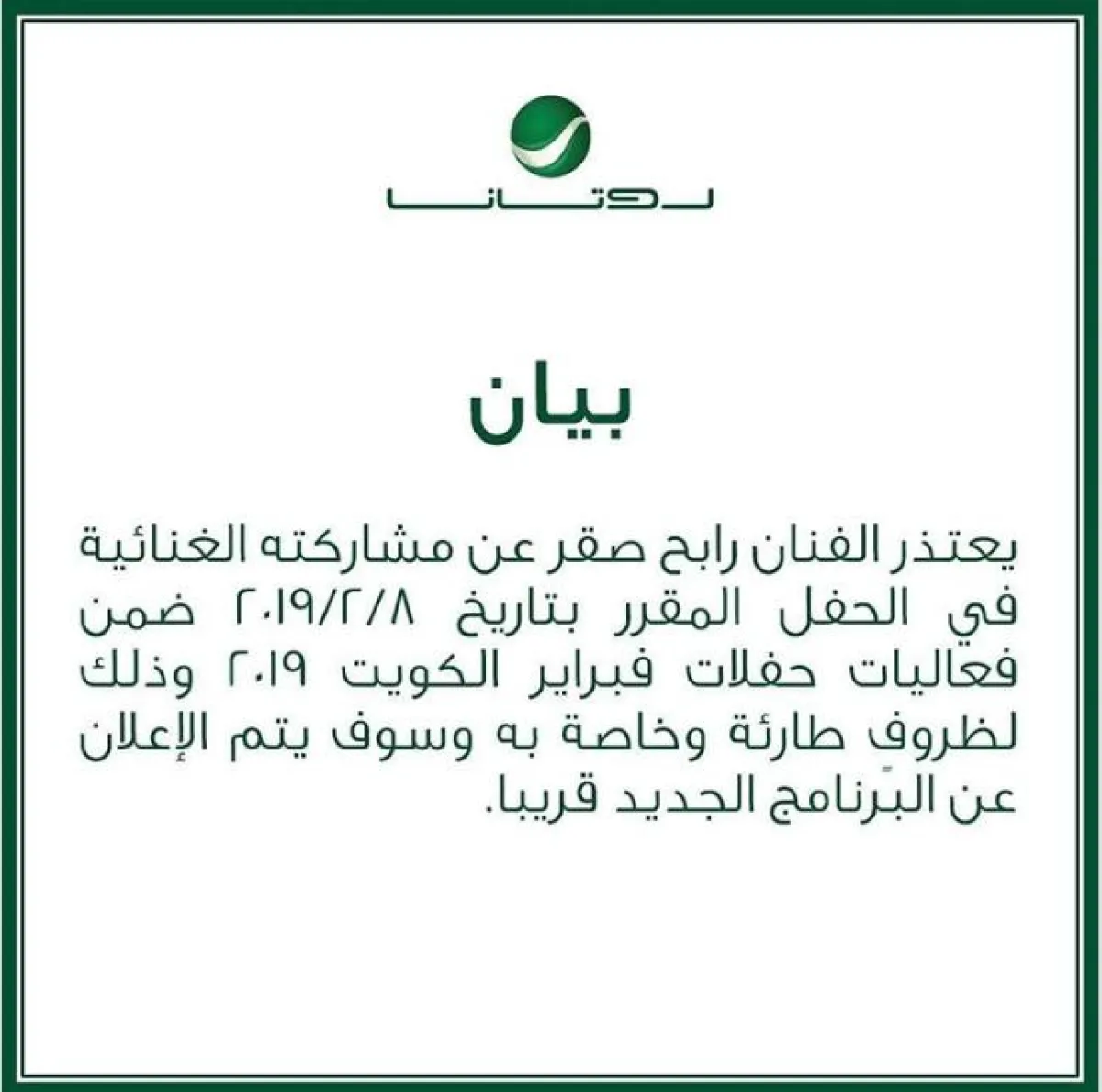 وأعلنت "روتانا" عن استبدال الفنان السعودي رابح صقر بالفنان اللبناني وائل كفوري، ونشرت الإعلان الخاص بالحفل، بعد أن قدّم الفنان صقر اعتذاره عن المشاركة في مهرجان "فبراير الكويت" لأسباب شخصية، من خلال تغريدة نشرها على "تويتر"، ثم ما لبثت أن أكدتها "روتانا" ببيان رسمي.