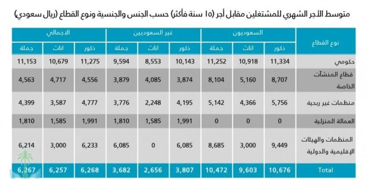 وأما متوسط الأجر الشهري للسعوديين العاملين في القطاع الحكومي فقد بلغ 11252 ريالًا، أما الأجانب فبلغ متوسط أجرهم 9594 ريالًا، وعن قطاع المنشآت الخاصة فبلغ متوسط الأجر بالنسبة للسعوديين العاملين به 8104 ريالات، مقابل 3879 ريالًا للأجانب.