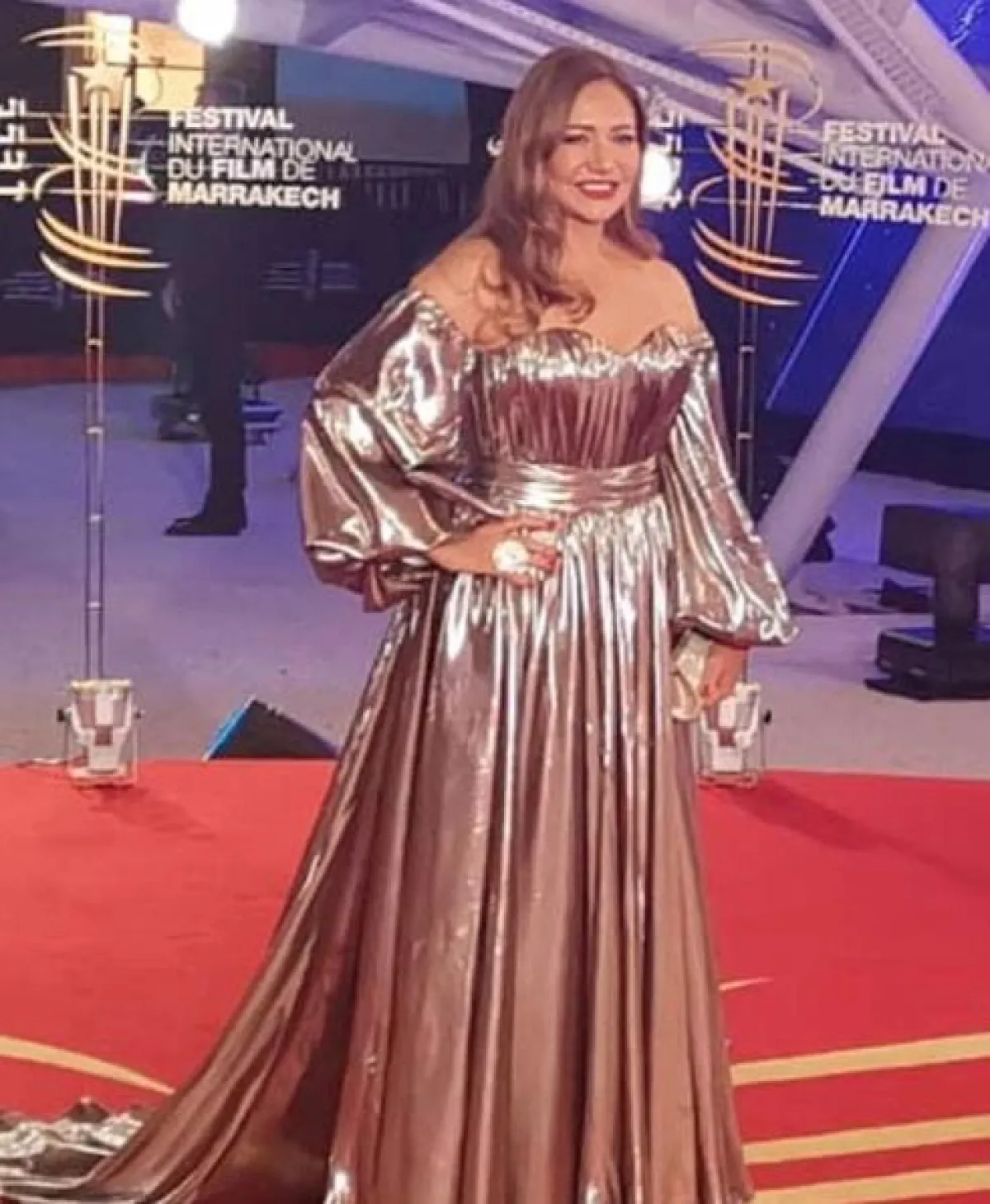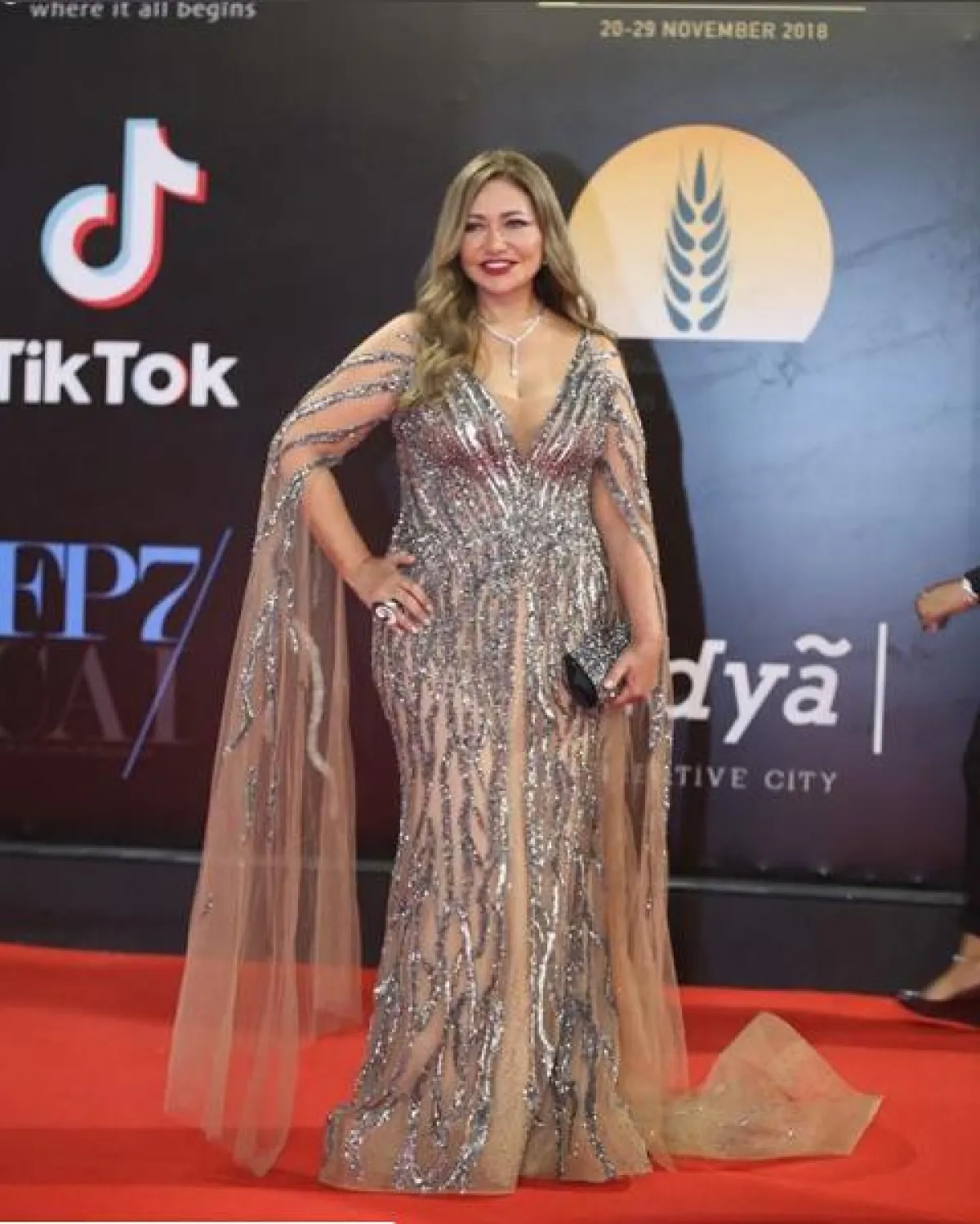 مع أنّ اللون الأبيض السكري لا يُنصح به عادةً للسيدات اللواتي يرغبن في أن يحصلن على اطلالات أكثر نحافة، غير أنه بدا خيارًا مثاليًّا بالنسبة لليلى علوي، ولاسيما أنّ قصة الفستان ناسبتها، فهو محدد الخصر مع تنورة كبيرة ومنسدلة. أكمامه متوسطة الطول وياقته مفتوحة على شكل حرف V، وقد نسقت معه شنطة يد باللون الفضي.