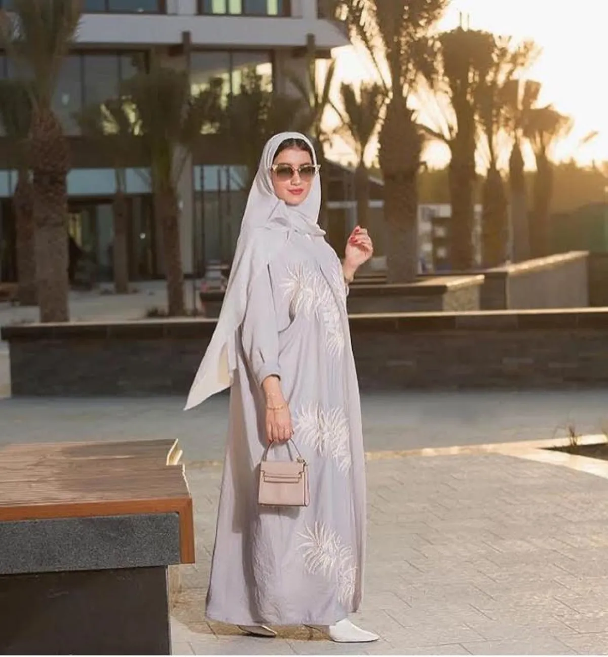 في المقابل ظهرت بعباية باللون الرمادي الفاتح مخملية وهادئة، لفتنا اختيارها لـ لفة حجاب من اللون نفسه، مع حذاء أبيض جاء مثاليًّا للمسة بسيطة وراقيه أيضًا.