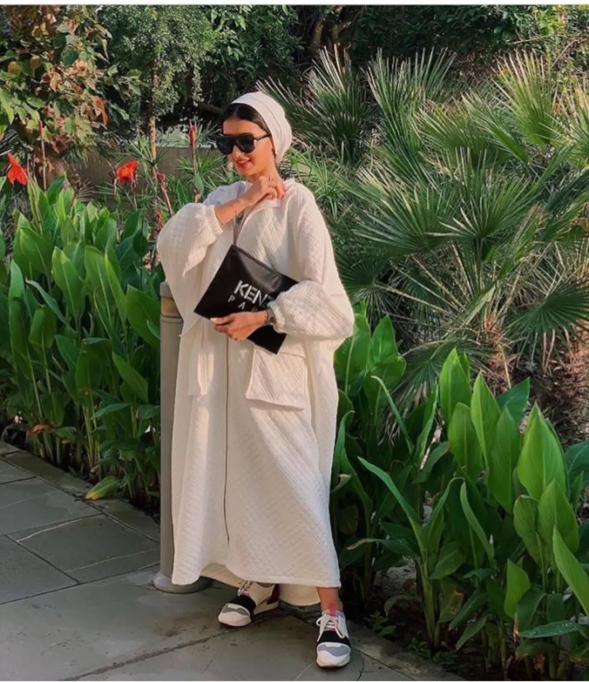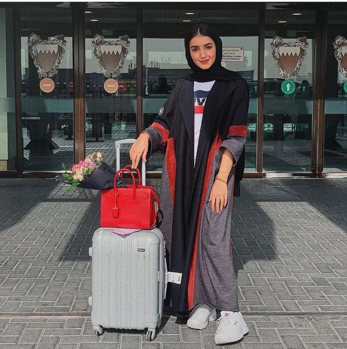 أثناء السفر لم تتخلَّ خولة عن الاطلالات الخاطفة للأنظار، وقد اعتمدها هذه المرة بالألوان الموجودة بـ العباية، كهذا الموديل مع الخطوط المراء الفيلفت، والرمادية مع الخلفية السوداء للعباية، نسقت معه السنيكرز الأبيض لم يبدُ مريحًا وأنيقًا فقط، بل بدت به شبابية وجذابة، ولم يضِف لها سنًّا على عكس كثير من اختياراتها الأخرى.