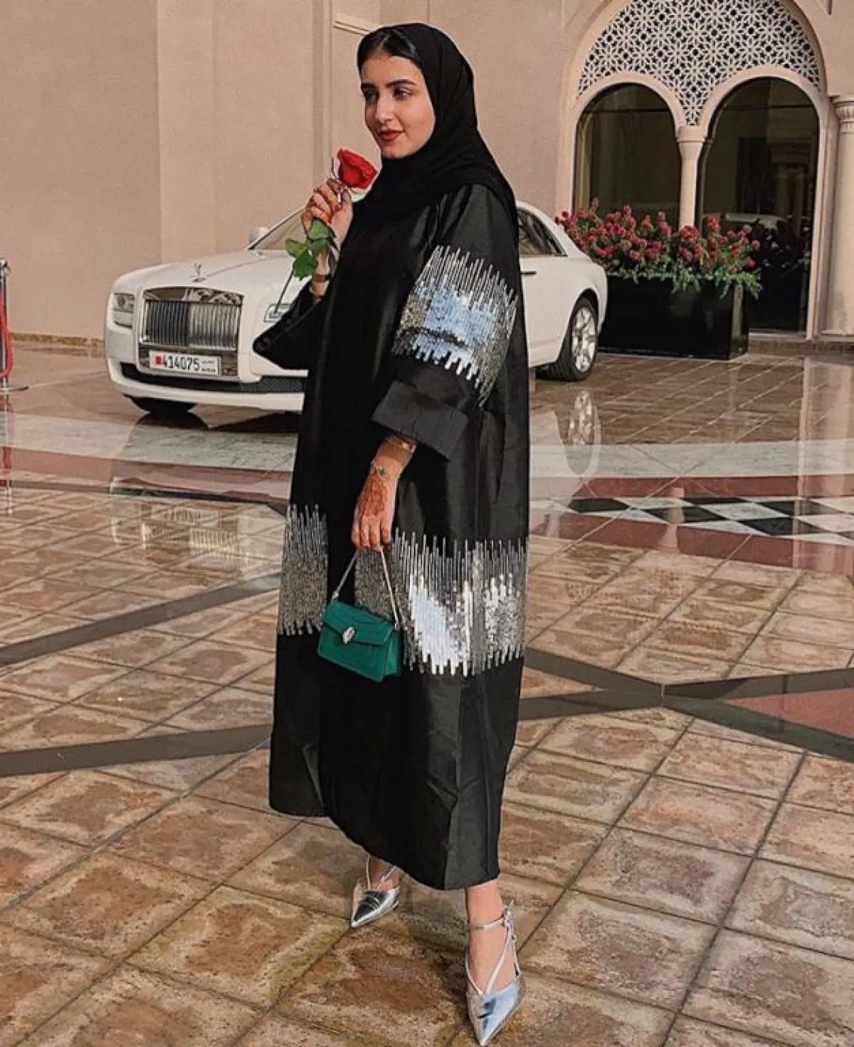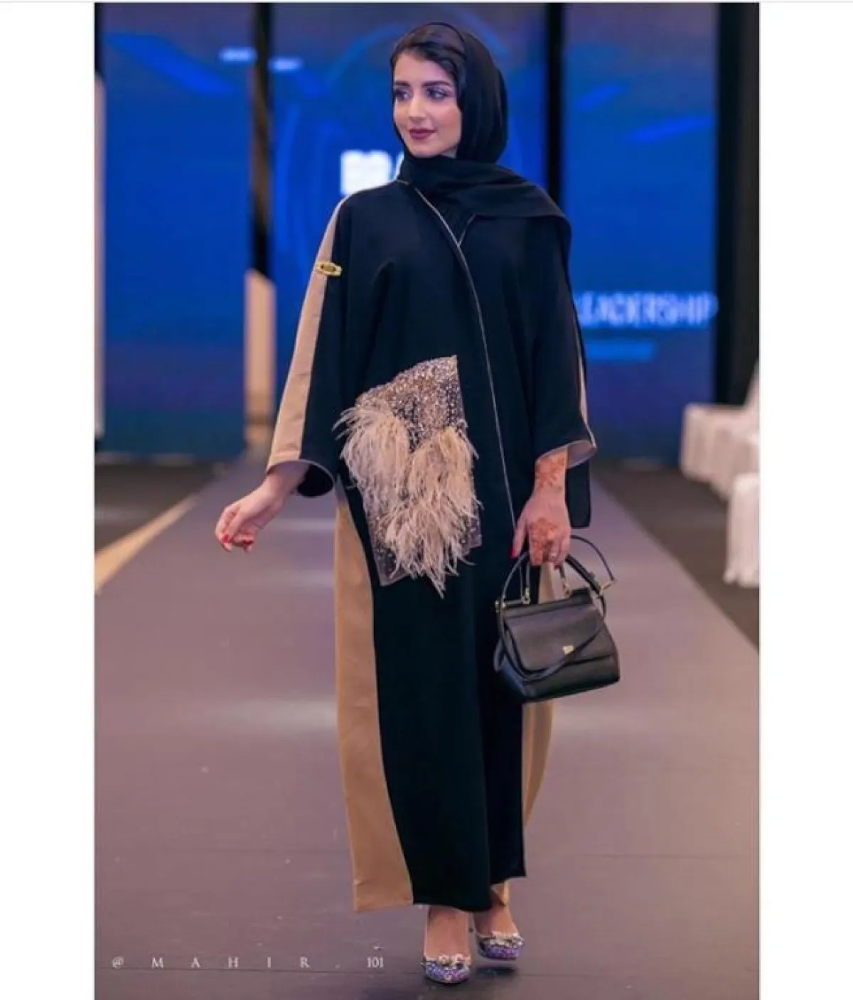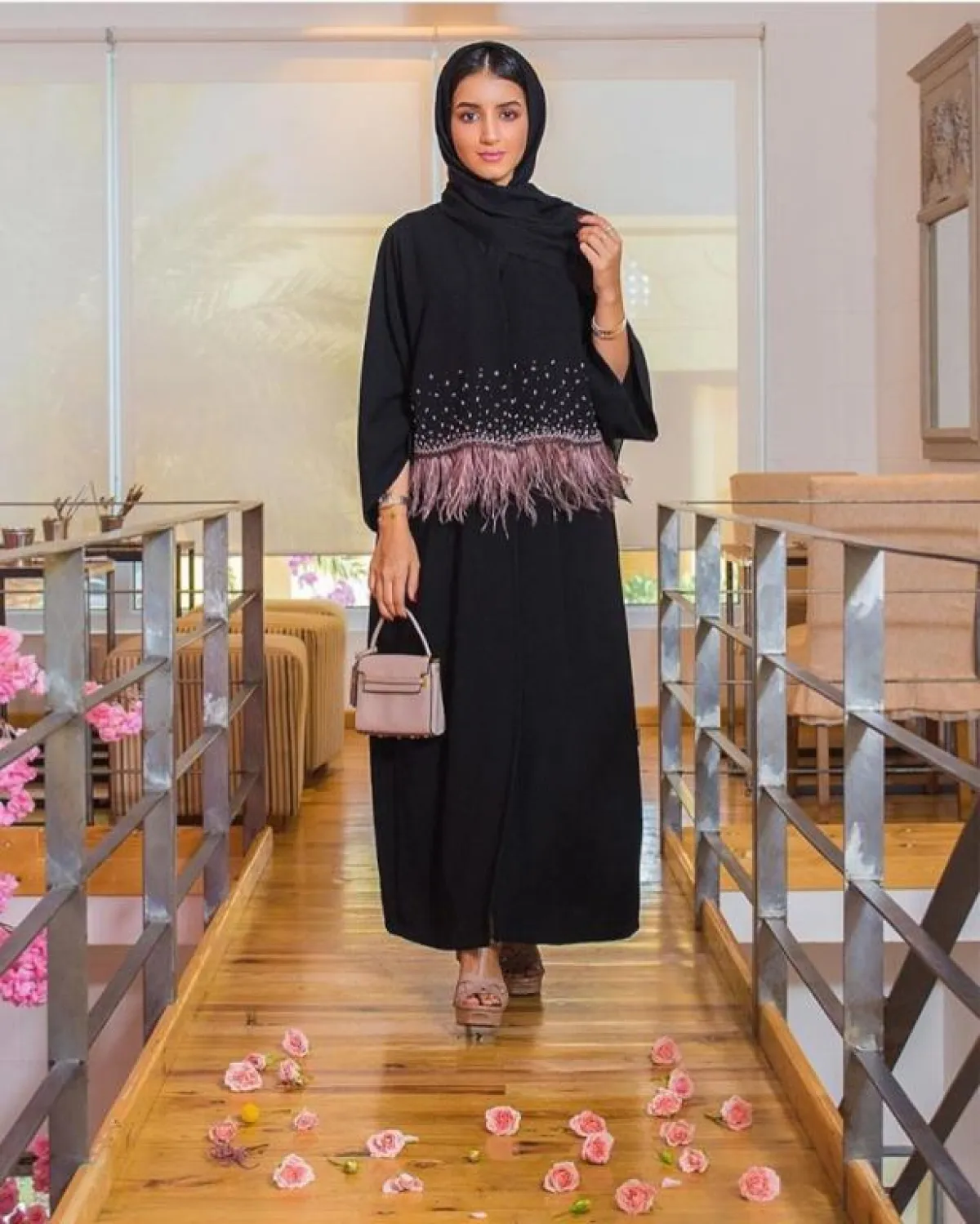 تطريزات الريش لطالما تعبّر عن الذوق المترف لصاحبة الاطلالة، كـ العباية بالتطريزات على أحد الجانبين، مع لمسة من القماش المخمل اللامع، لكنها هذه المرة جاءت أنيقة وفخمة من دون مبالغة، بخاصة عندما نسقت معها شنطة سوداء وحذاء ميتالك مدببًا.