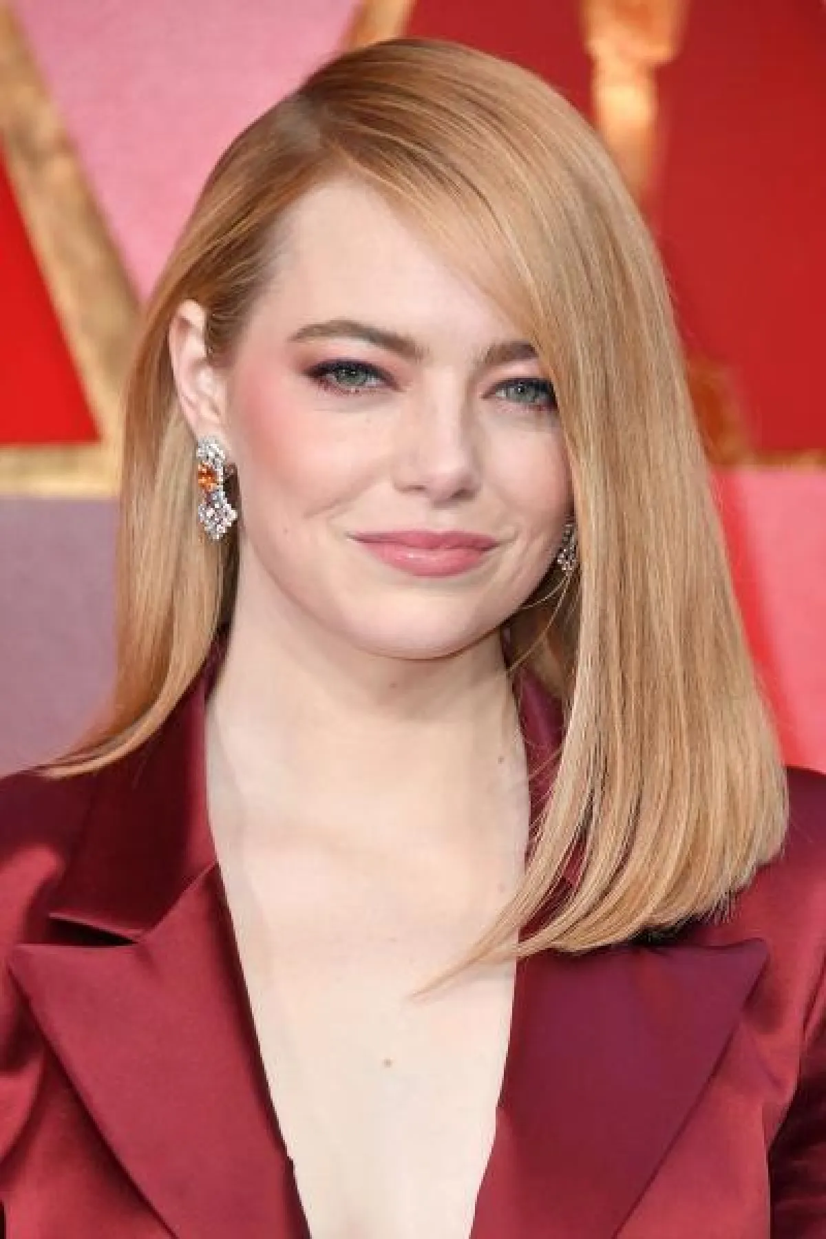 النجمة إيما ستون اعتمدت مكياجاً مشرقاً عادت فيه الى مرحلة الثمانينات، حيث استخدمت البلاش الزهري بطريقة ظاهرة جداً حول العينين وأعلى الوجنتين، واعتمدت أيضاً أحمر الشفاه الزهري اللامع، أما مكياج العيون فارتكزعلى خطوط الأيلاينر الأسود في موازاة الجفون العليا. في المقابل، اعتمدت إيما ستون تسريحة الكاريه الناعمة المنسدلة والتي عززت من أنوثتها ورقي إطلالاتها.