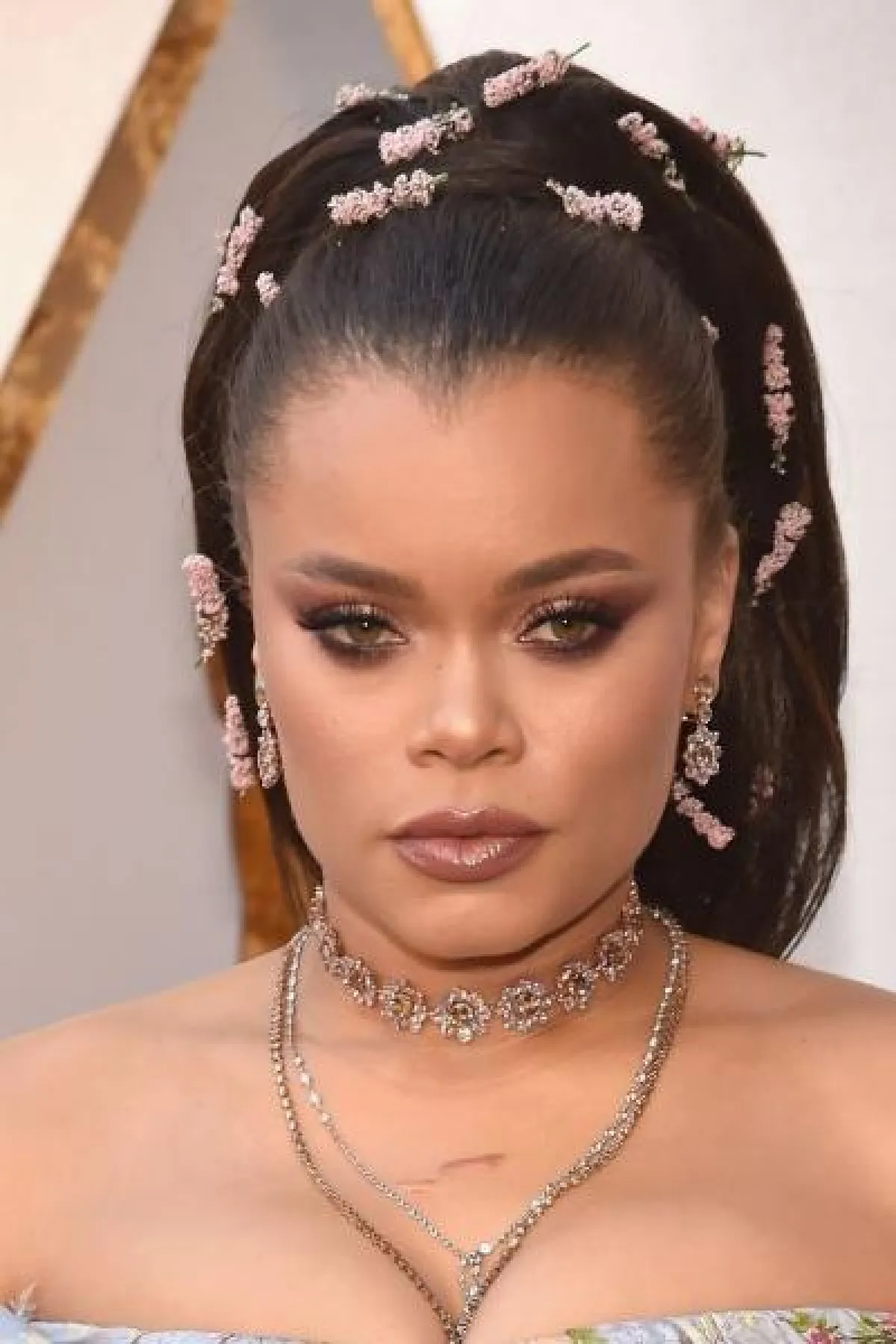 وككثيرات من النجمات، اعتمدت النجمة أوندرا داي Andra Day خلال أوسكار 2018 مكياج عيون سموكي بالألوان البرونزية الجذابة، كذلك أتت بشرتها بنغمات برونزية راقية، فيما اعتمدت أحمر الشفاه النيود اللامع. أما اللافت في إطلالتها، فكان الزهور الطبيعية التي زيّنت بها تسريحة ذيل الحصان المرتفعة التي اعتمدتها، فجاءت إطلالتها في منتهى الرقي والجمال.