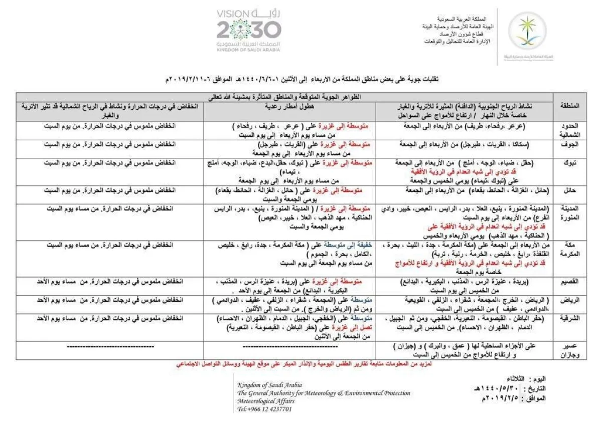 كشفت الهيئة العامة للأرصاد والبيئة السعودية عن حدوث بعض التقلبات الجوية بمشيئة الله تعالى على معظم مناطق البلاد ابتداءً من مساء اليوم الأربعاء 2019/02/06، تستمر إلى الاثنين، حيث تتسم الأجواء بنشاط في الرياح المثيرة للأتربة والغبار، وهطول أمطار رعدية، مع انخفاض في درجات الحرارة.