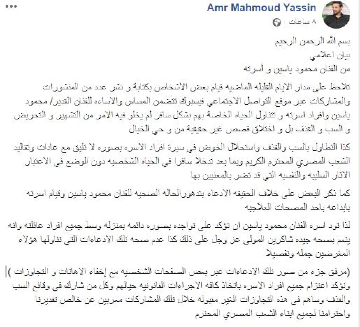 البيان الجماعي صدر باسم محمود ياسين وزوجته شهيرة وابنته رانيا ياسين وابنهما المؤلف عمرو ياسين، وقال: نلاحظ على مدار الأيام القليلة الماضية قيام بعض الأشخاص بكتابة ونشر عدد من المنشورات والمشاركات عبر موقع التواصل الاجتماعي فيسبوك، تتضمن المساس والإساءة للفنان القدير محمود ياسين وأفراد أسرته، وتتناول الحياة الخاصة بهم بشكل سافر لم يخلُ فيه الأمر من التشهير والتحريض والسب والقذف، بل واختلاق قصص غير حقيقية من وحي الخيال.