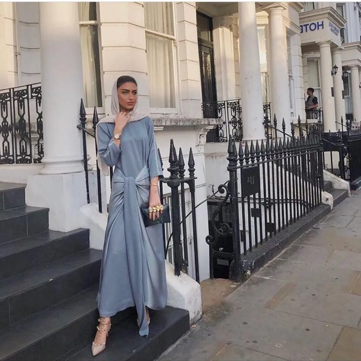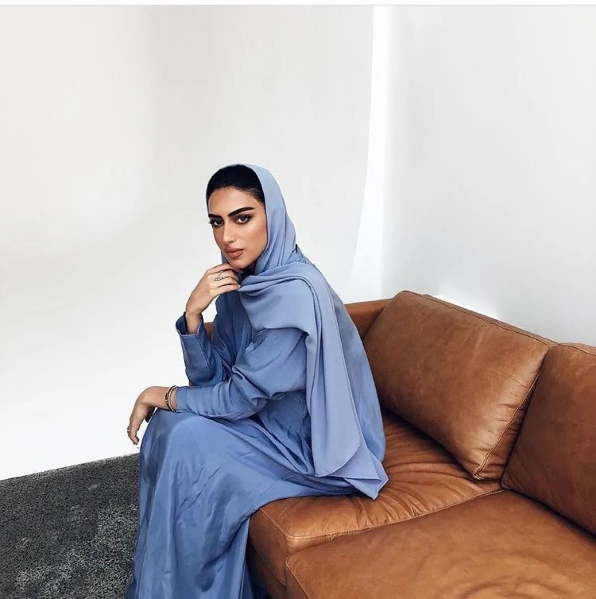 كونها خبيرة مكياج فهي تعرف جيدًا مدى أهمية اختيار الألوان في اطلالة الفتاة، لهذا أعجبنا اختيارها للسماوي الأزرق بـ العباية بخامة الستان الحريري، مع حجاب بدرجة أفتح قليلًا كان مثاليًّا للون بشرتها.