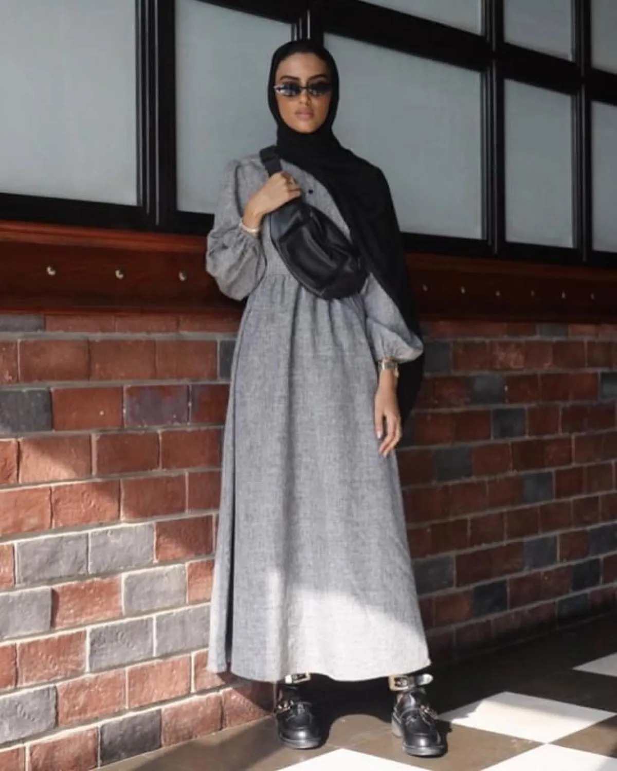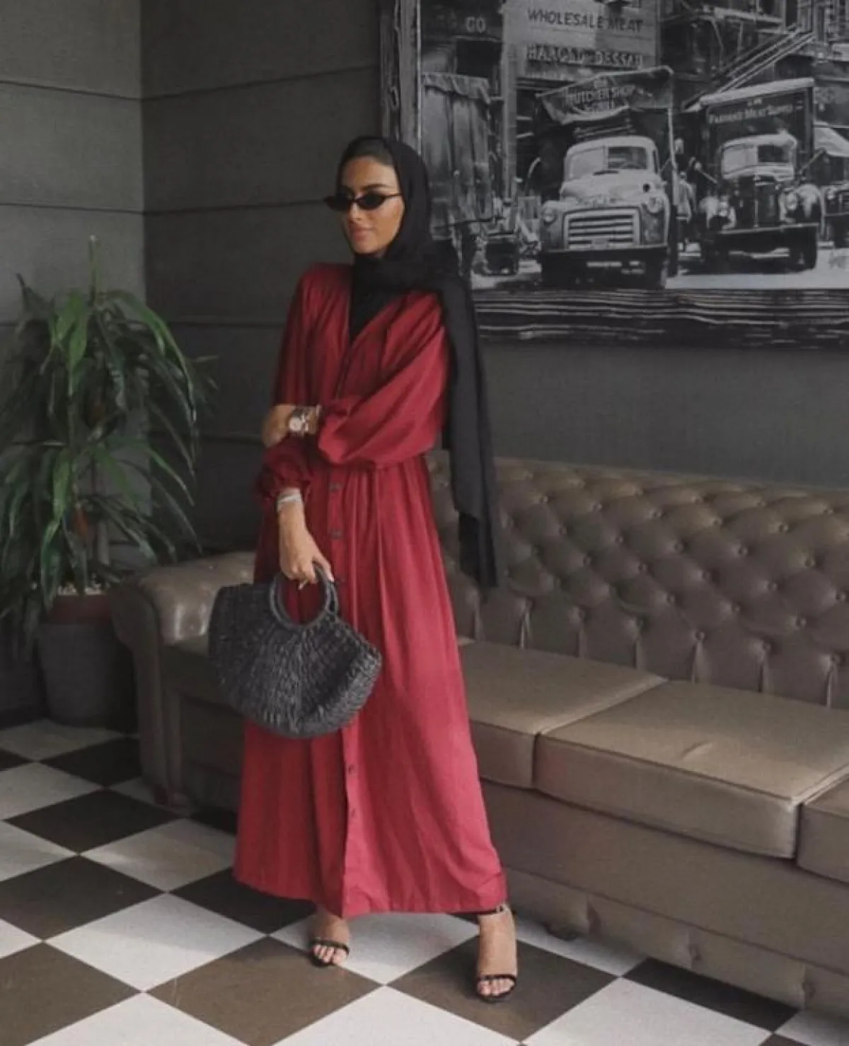 وكذلك الحجاب باللون الأحمر ولكنها اختارت الدرجة الهادئة منه، ليتناغم مع بشرتها أكثر، ونسقته مع حجاب أسود وصندل باللون ذاته، لاطلالة راقية تناسبكِ طوال اليوم، كما أنها تضيف لكِ لمسة شبابية، وتجعلكِ تبدين أصغر عمرًا، بتصميمها البسيط والهادئ.