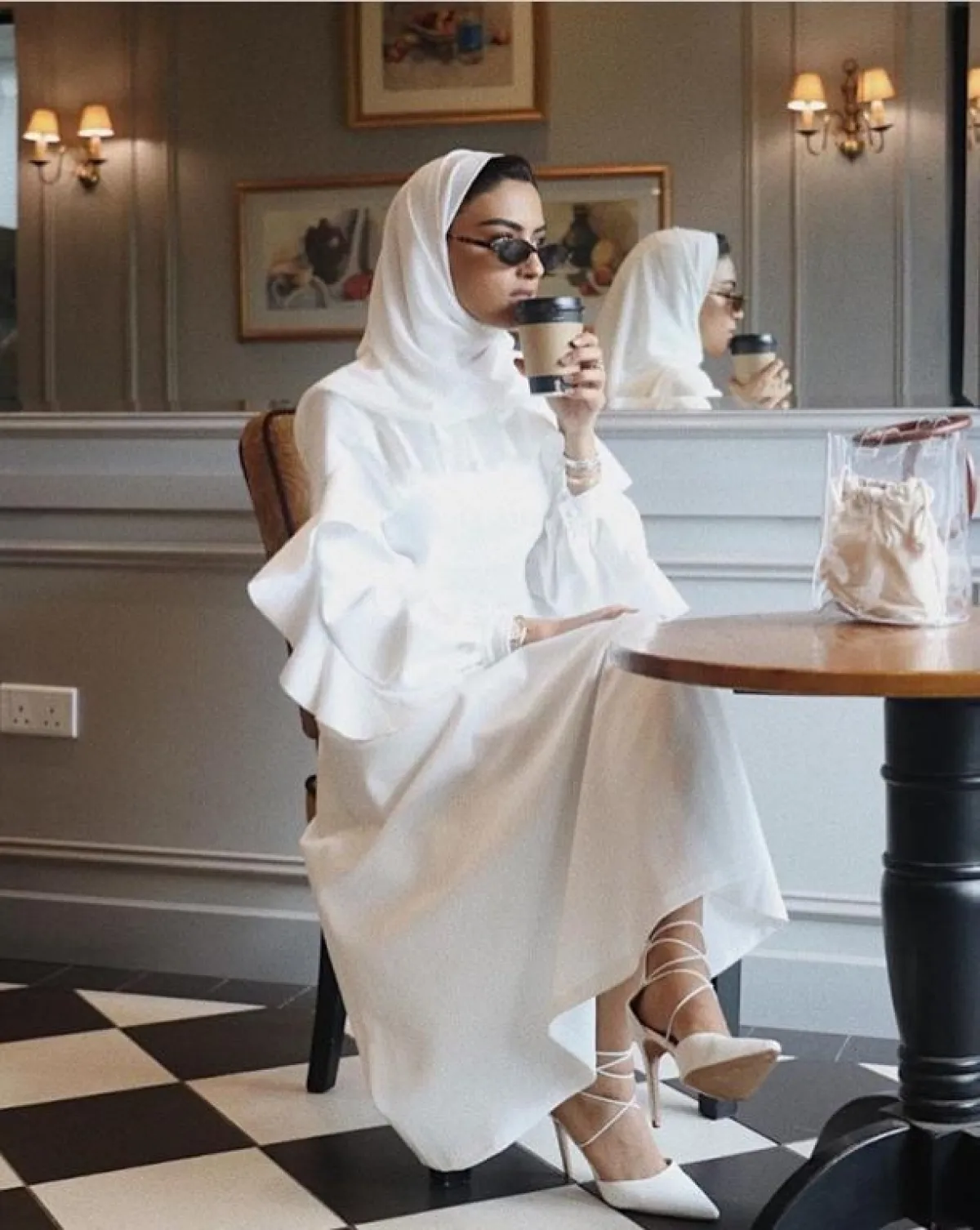 تتمتع يارا ببشرة خمرية وملامح شرقية، يناسبها كثيرًا العبايات المخملية بخاصة اللون الأبيض والكريمي، لذلك بدت أنيقة وناعمة بالعباية البيضاء، مع الكشكش على الأكمام، اعتمدتها بالأسلوب الحيادي، بارتداء حذاء برباط الكاحل ذي لمسة أنثوية مثيرة، مع حجاب باللون الأبيض، واعتمدت على الشنطة الدلو الشفافة التي عبّرت عن خياراتها الشبابية والعصرية بشكل عام.