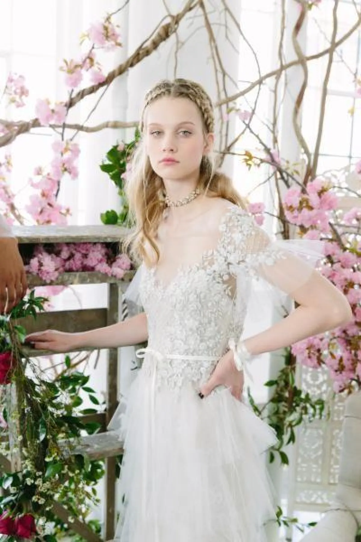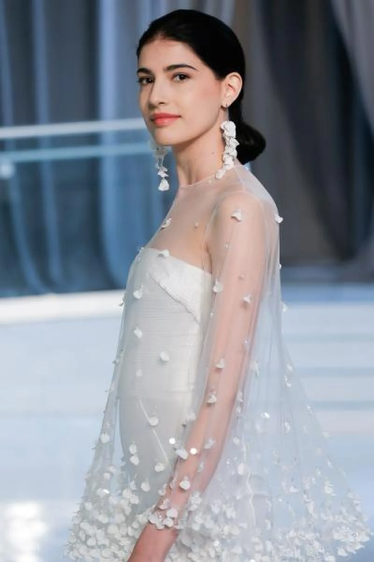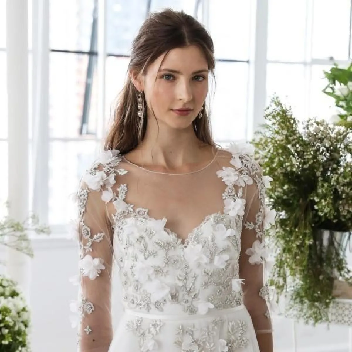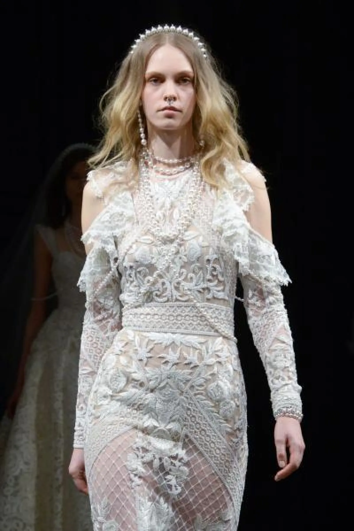 ثوب الزفاف بالياقة العالية High Neck: إذا كان الفستان بياقة عالية تغطّي الرقبة، يجب التركيز على إكسسوارات الشعر المرصّعة مع وضع سوار أو خاتم كوكتيل فخم.