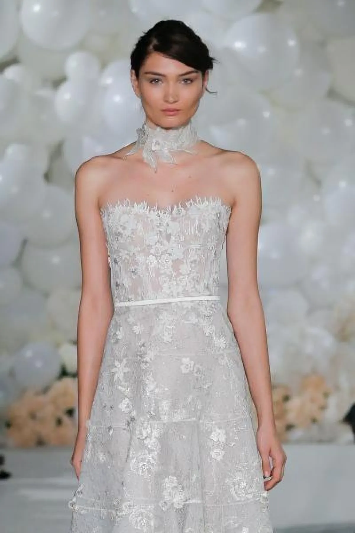 ثوب الزفاف بياقة حرف V: يفضّل وضع قلادة بسيطة ومتوسّطة الطول، اختاري سلسلة مع "تعليقة" كما يقال لها في العاميّة بحجم صغير، وكذلك أقراط ناعمة تتناسب مع تصميم القلادة.