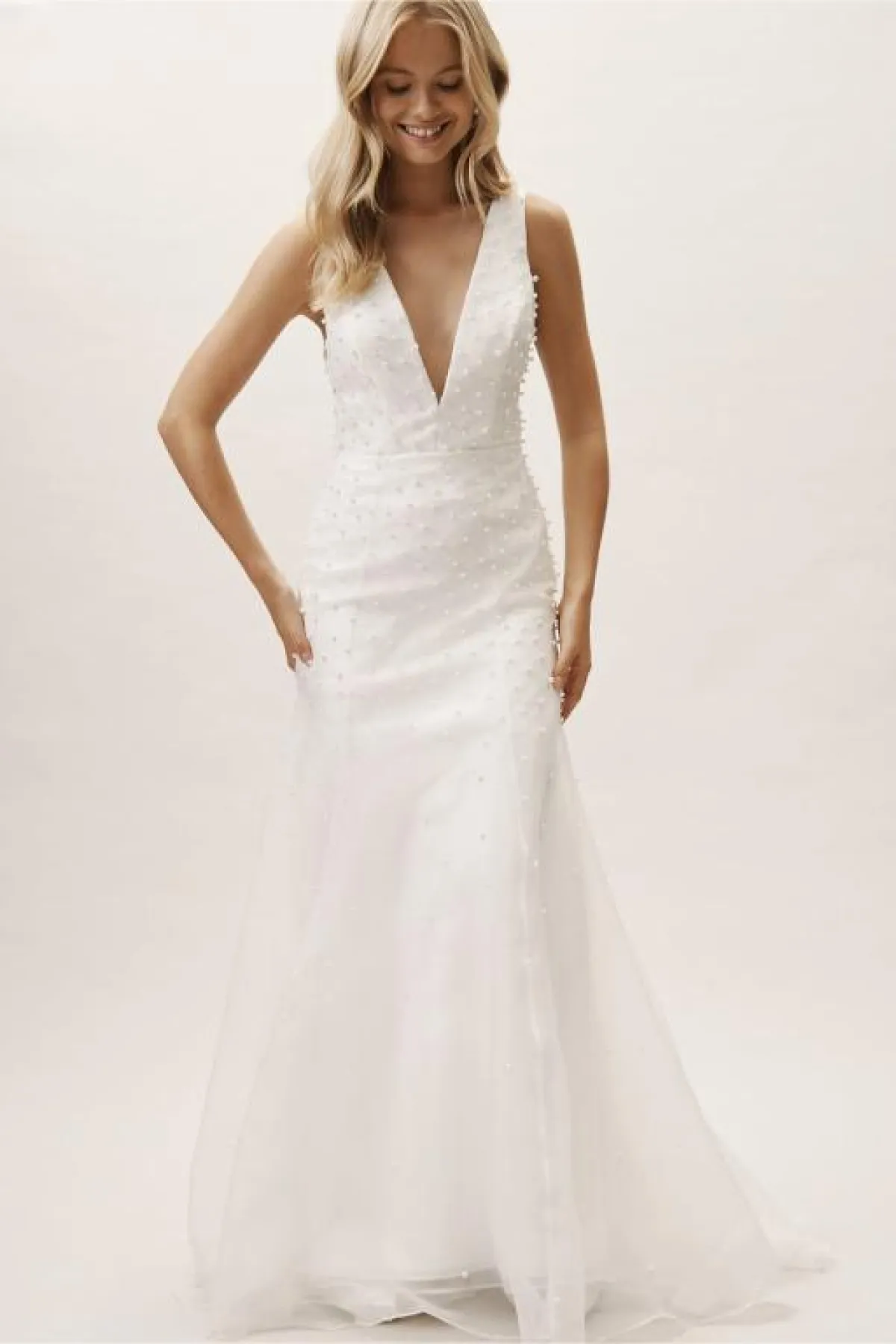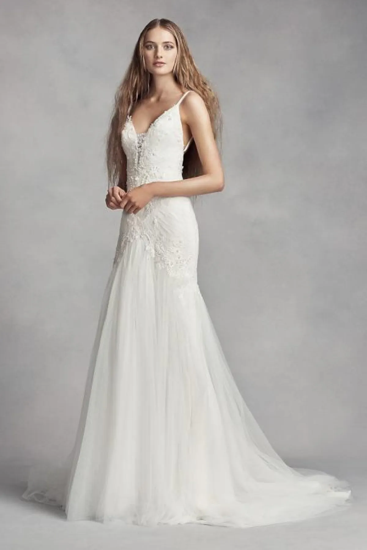 لفتنا كذلك الفستان بتصميم الميرماد منفوش قليلًا باللون الأبيض الناصع، مع تطريزات التول متفرعة بشكل متوازٍ على الفستان ككل، مع فتحة الصدر بحرف V تناسب المراة النحيفة والطويلة.