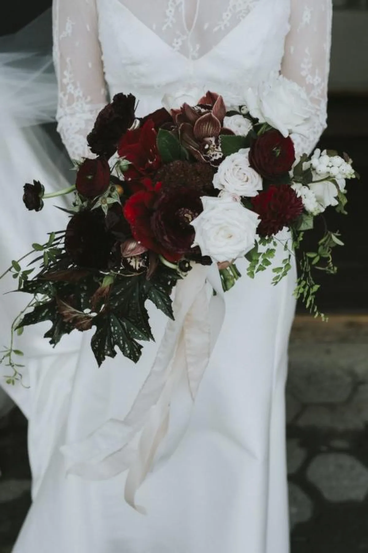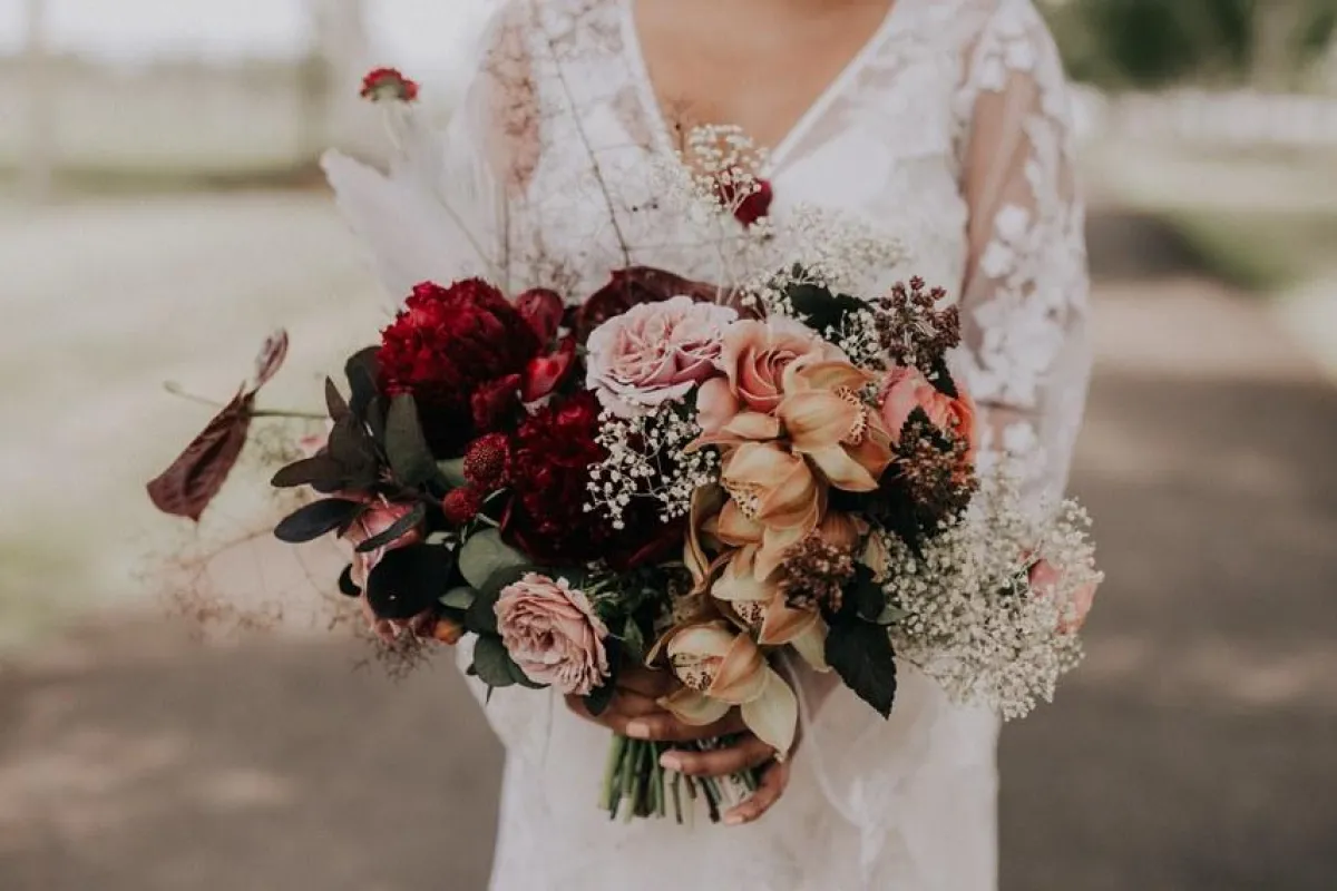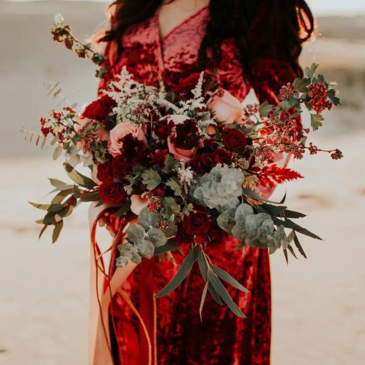 أما إن كان فستانك ذهبي اللون قليلا، فاختاري مسكات عروس بالورود الحمراء مع ألوان متداخلة أخرى كالأبيض والأصفر، أو الأحمر مع بعض الورود الروز لتكمل الإطلالة المخملية التي اعتمدتيها.