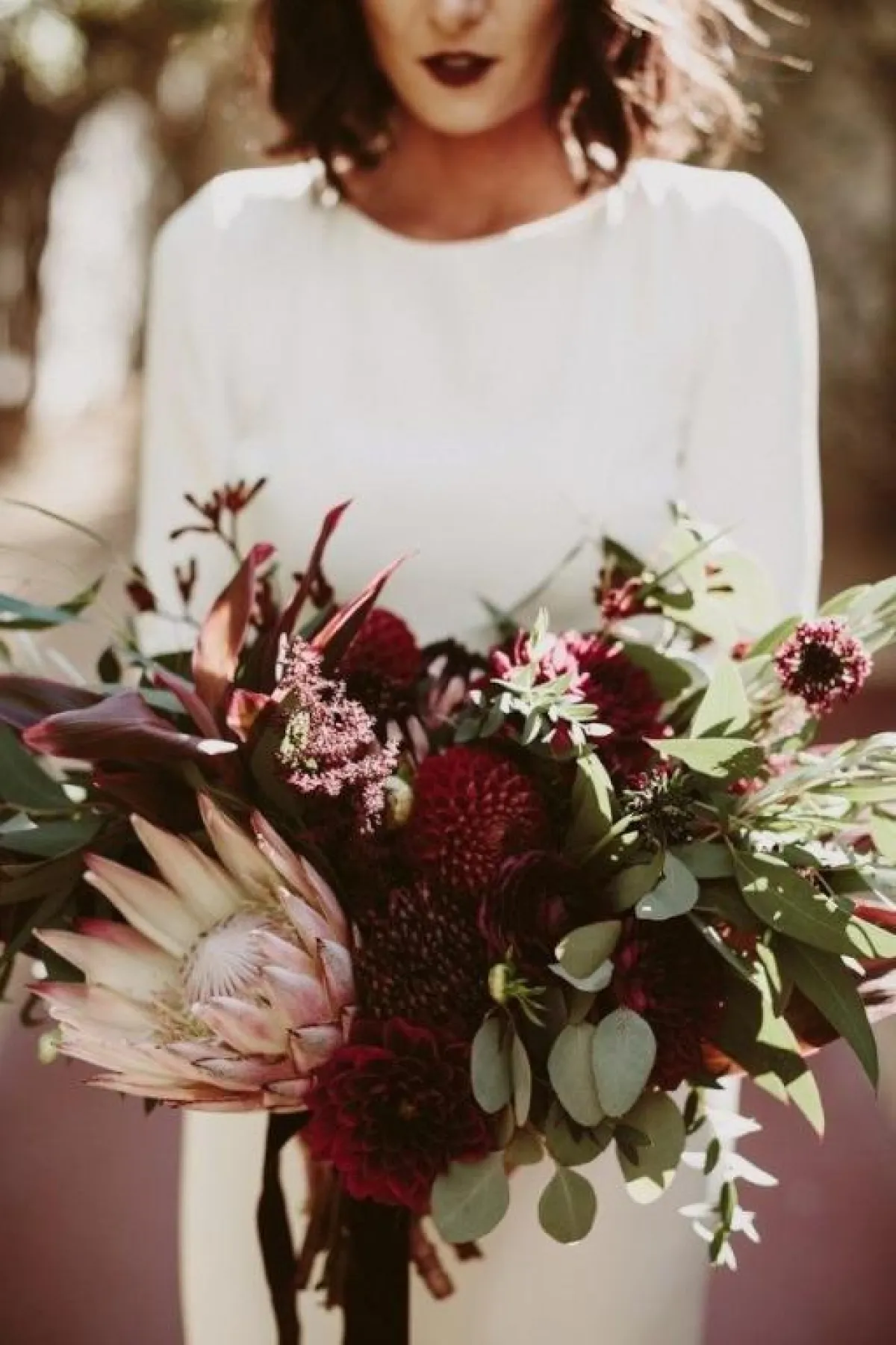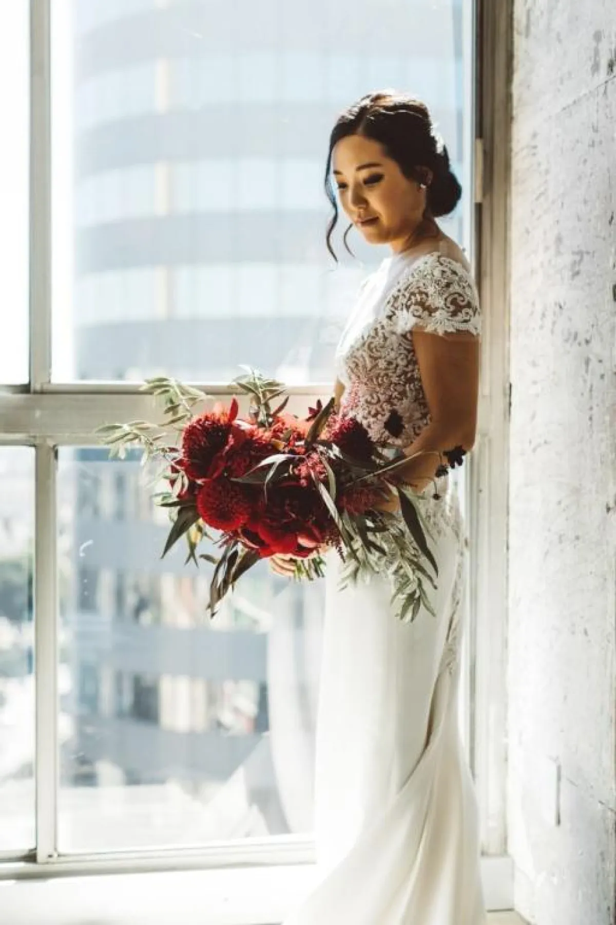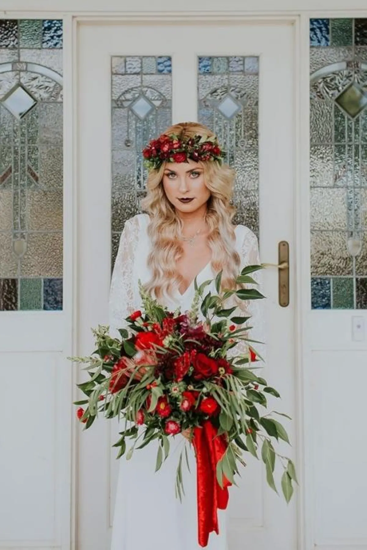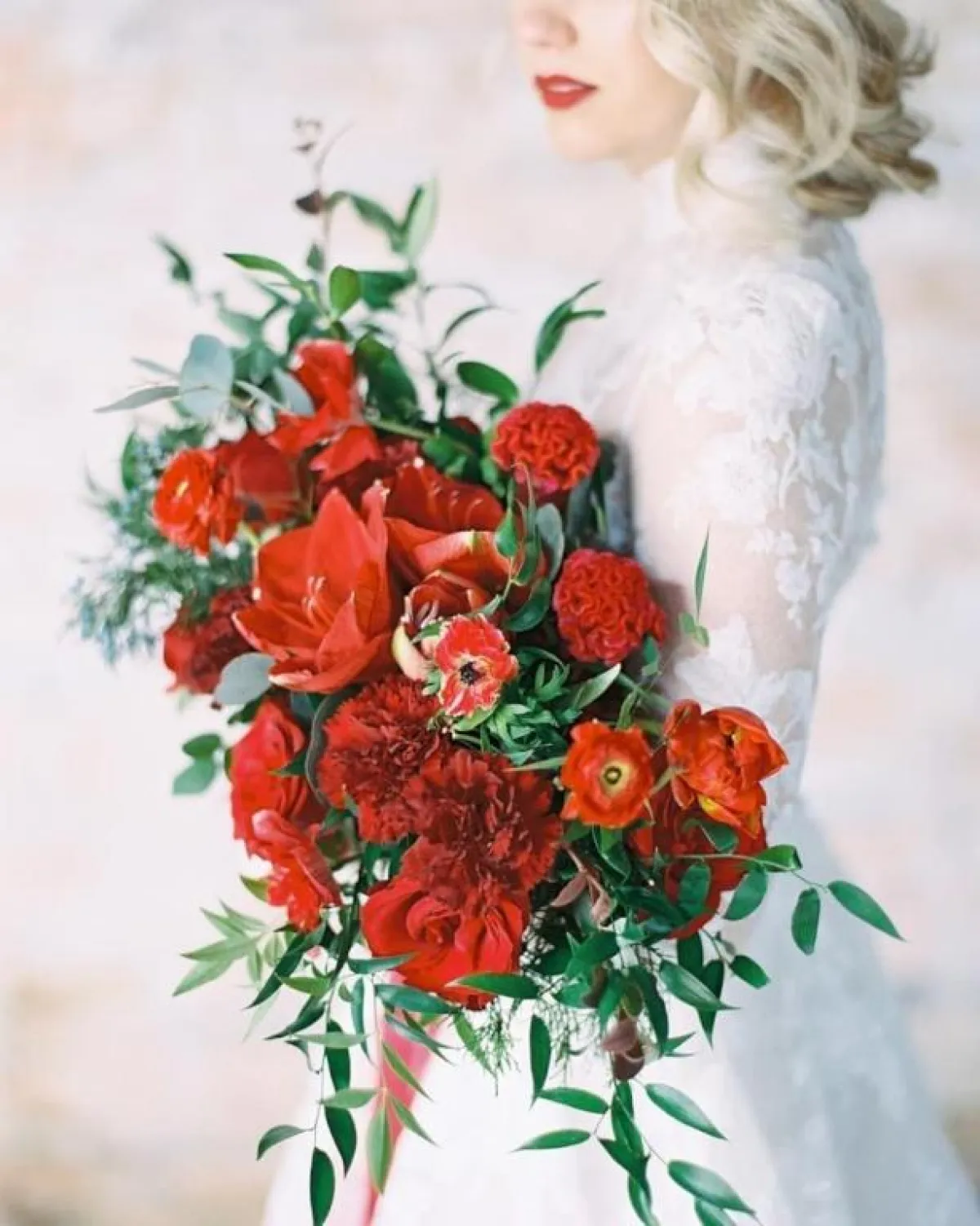 يمكنك اعتماد الورد الأحمر مع الفروع الخضراء، ليبدو متناغما مع فستان زفافك الأبيض، خاصة وإن اخترتي الدرجة الصريحة، لإطلالة بسيطة وهادئة.