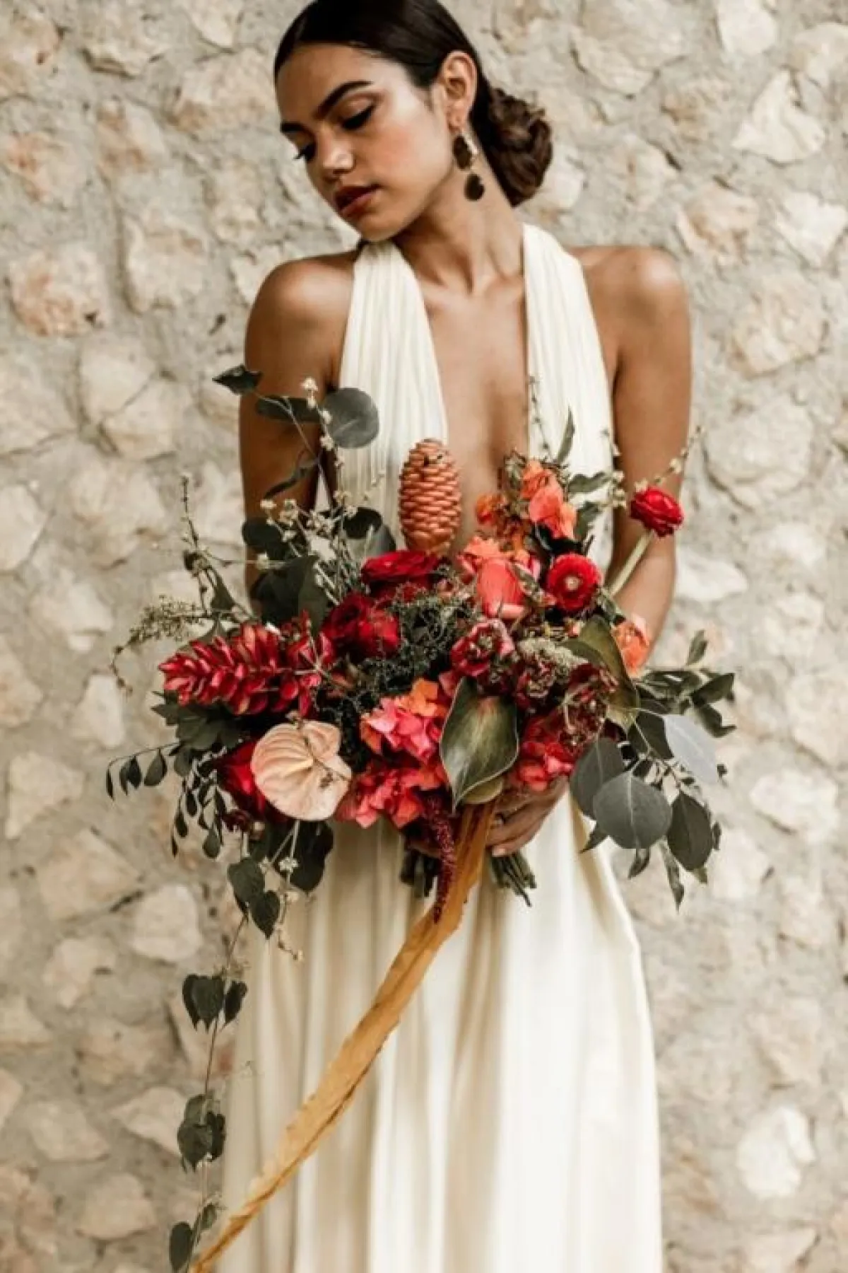 إذا كنت تحبين الطبيعة فاختاري أكثر من لون لمسكة العروس على أن يكون الاحمر هو الدرجة الغالبة، وادخلي كل الزهور التي التحبيها لتعكس شخصيتك المرحة.
